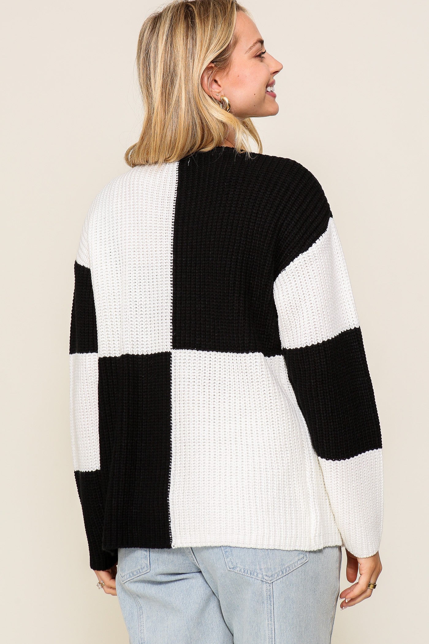 Indulge in the embrace of a cozy, long-sleeved, buttoned checkered cable knit sweater.