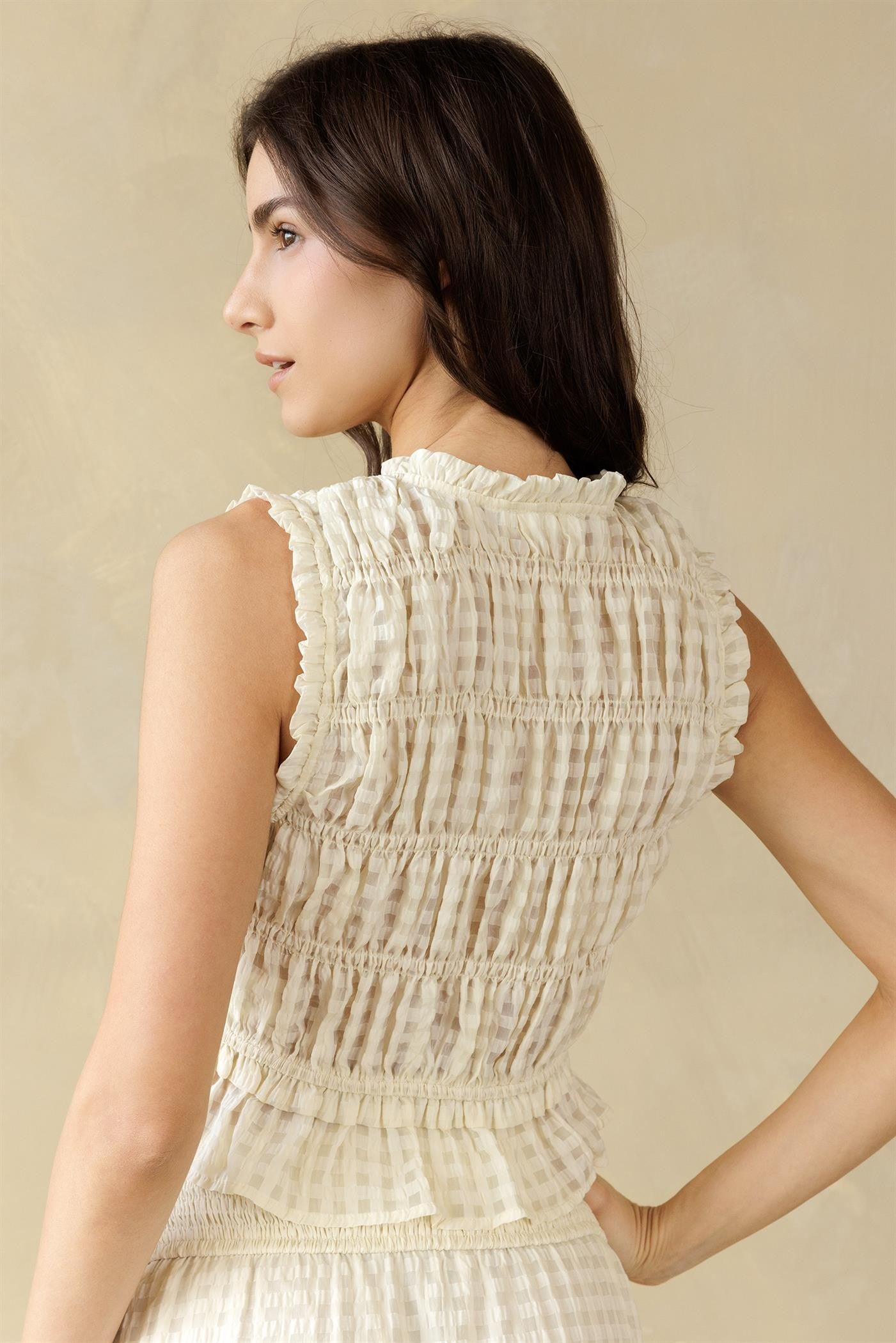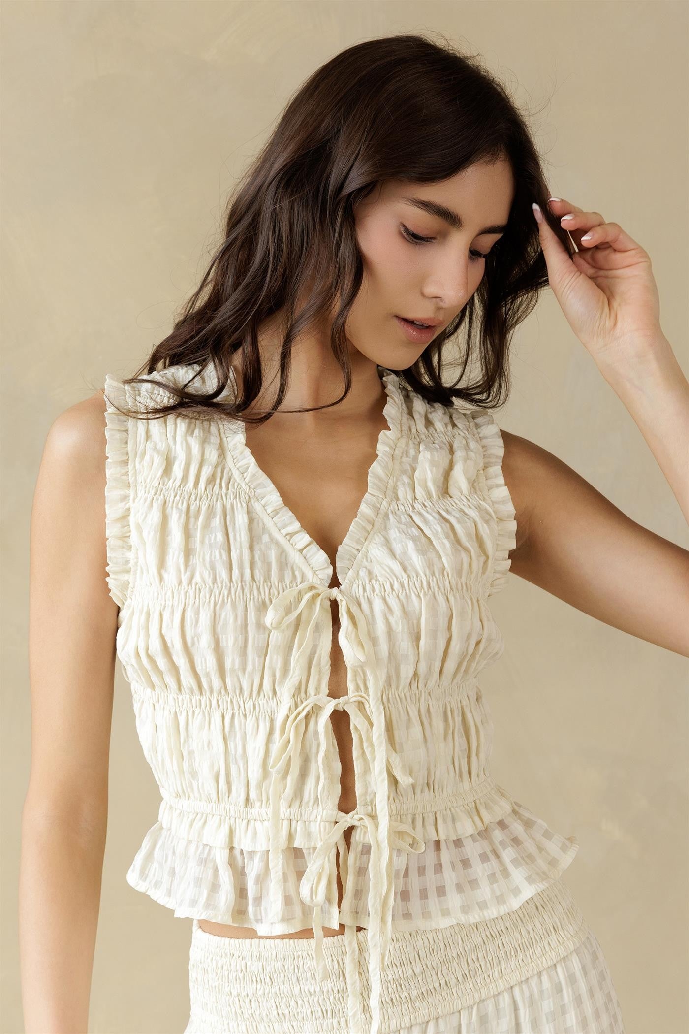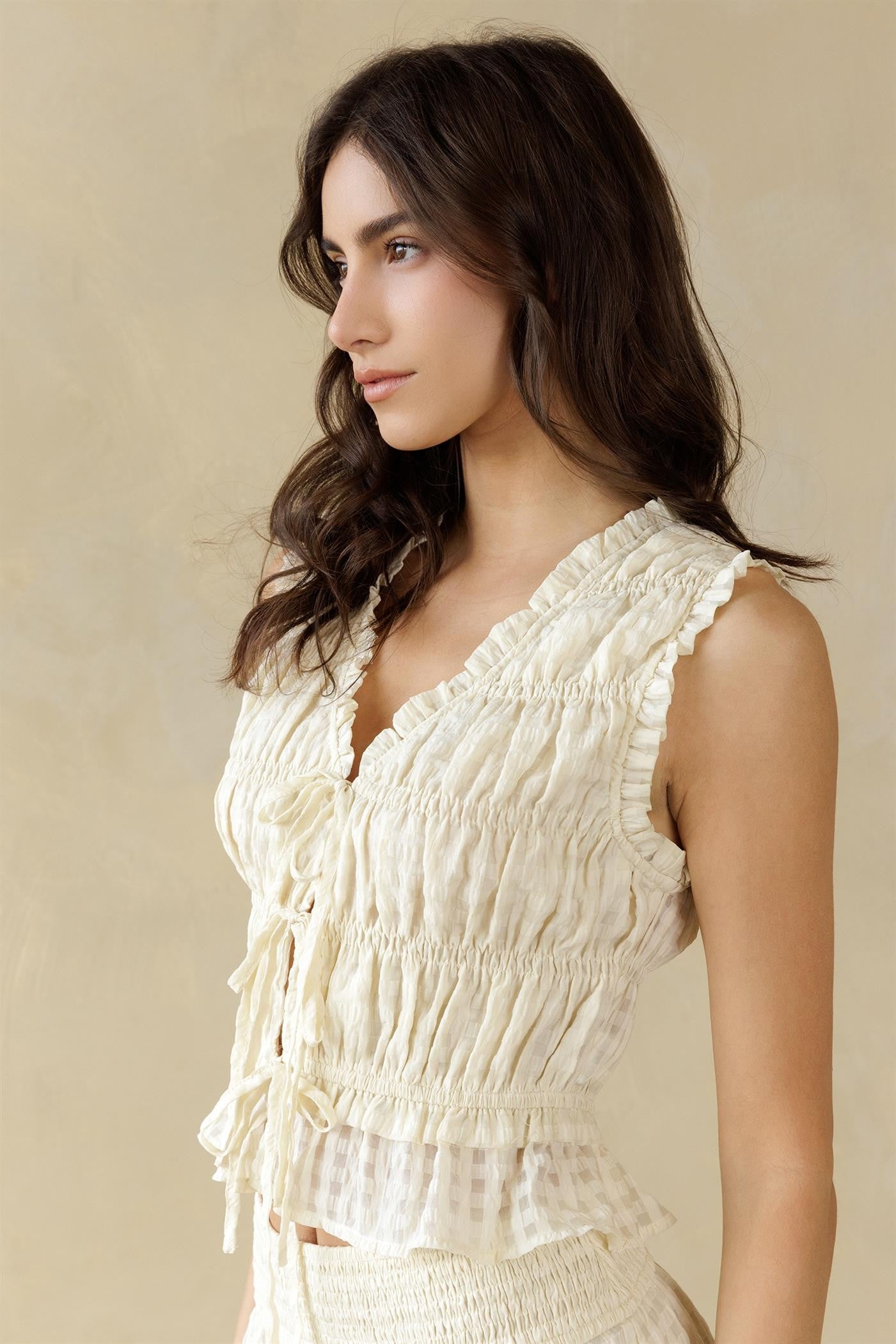 Elevate your wardrobe with this delicate and feminine sleeveless top, crafted from a light, airy fabric with a subtle checkered texture. Featuring a ruched design throughout, it offers a flattering, fitted silhouette with charming ruffle details along the edges. The front ties add a touch of romance, while the soft peplum hem provides a graceful, flowy finish.