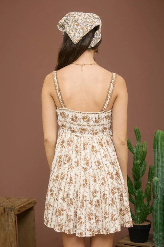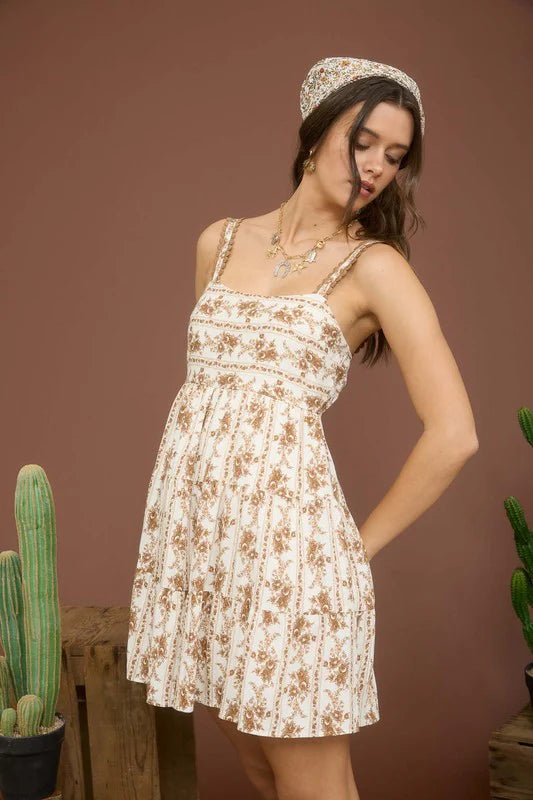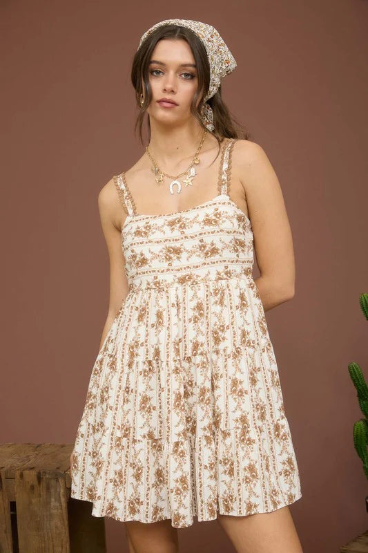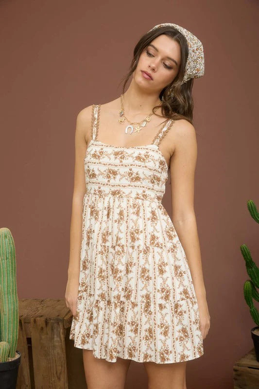 This playful mini dress features a flattering square neckline, delicate lace strap detail, and back smocking for a comfortable fit. Tiered layers add movement and dimension, while the stripe floral pattern adds a touch of whimsy. Stay cool and stylish in this lined, sleeveless dress.