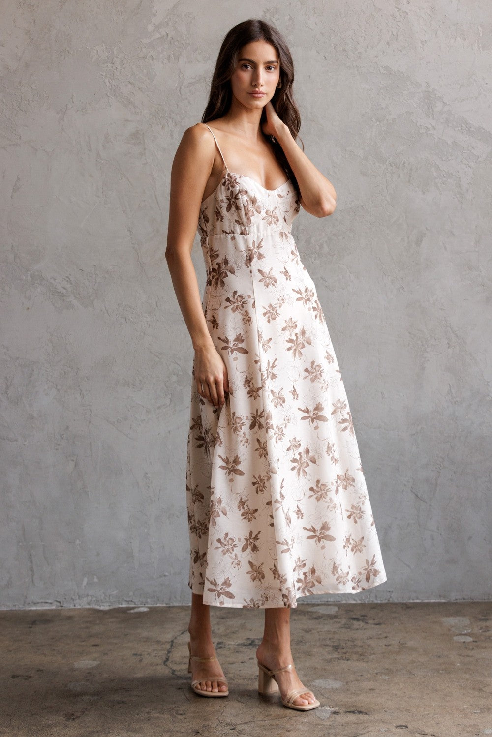 Beige base with painterly brown floral print - Slim fit through the bodice with a flowy A-line skirt - Sweetheart neckline with lightly structured bustier-style seaming - Adjustable spaghetti straps - Hidden back zipper -Fully lined