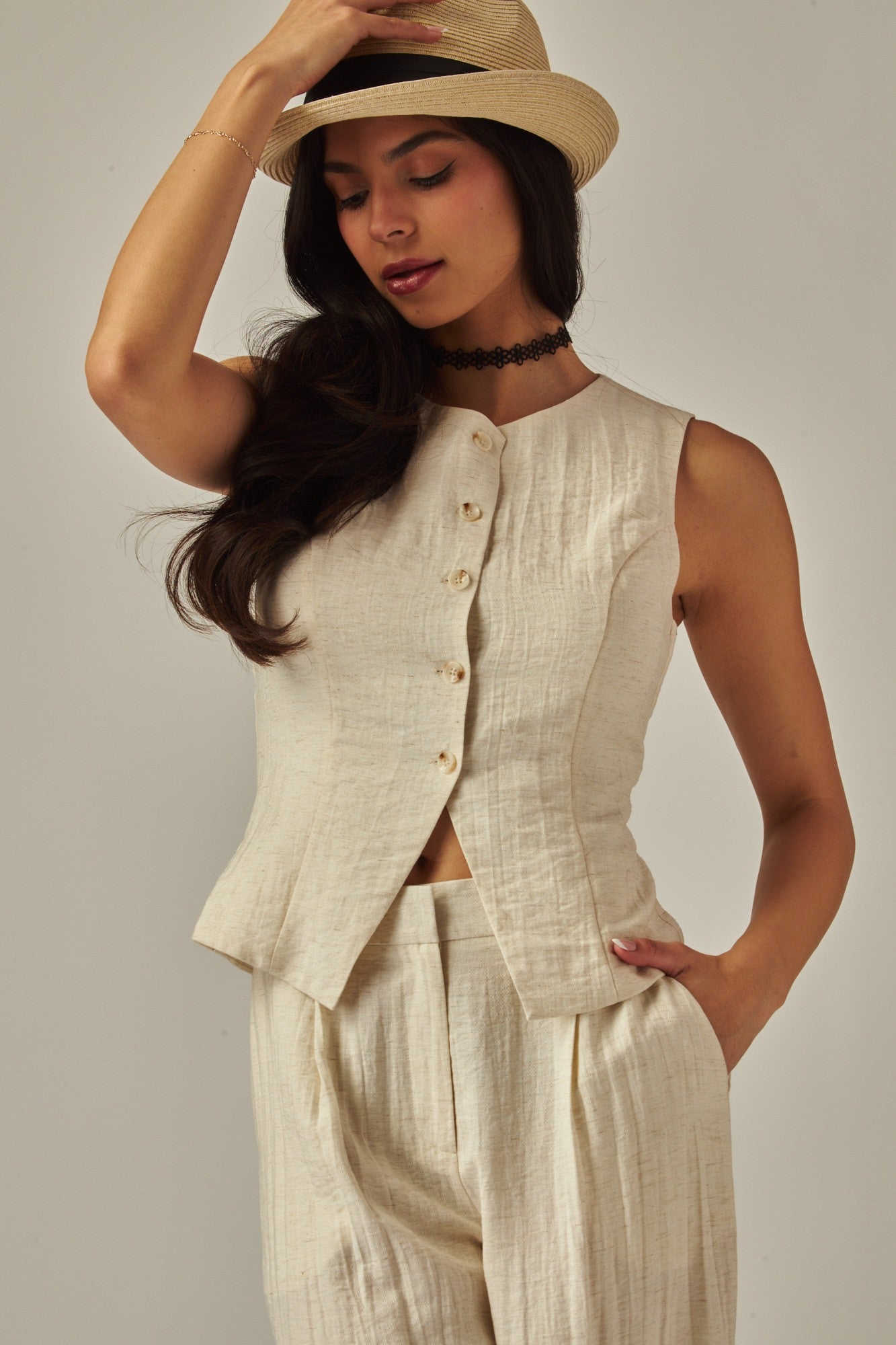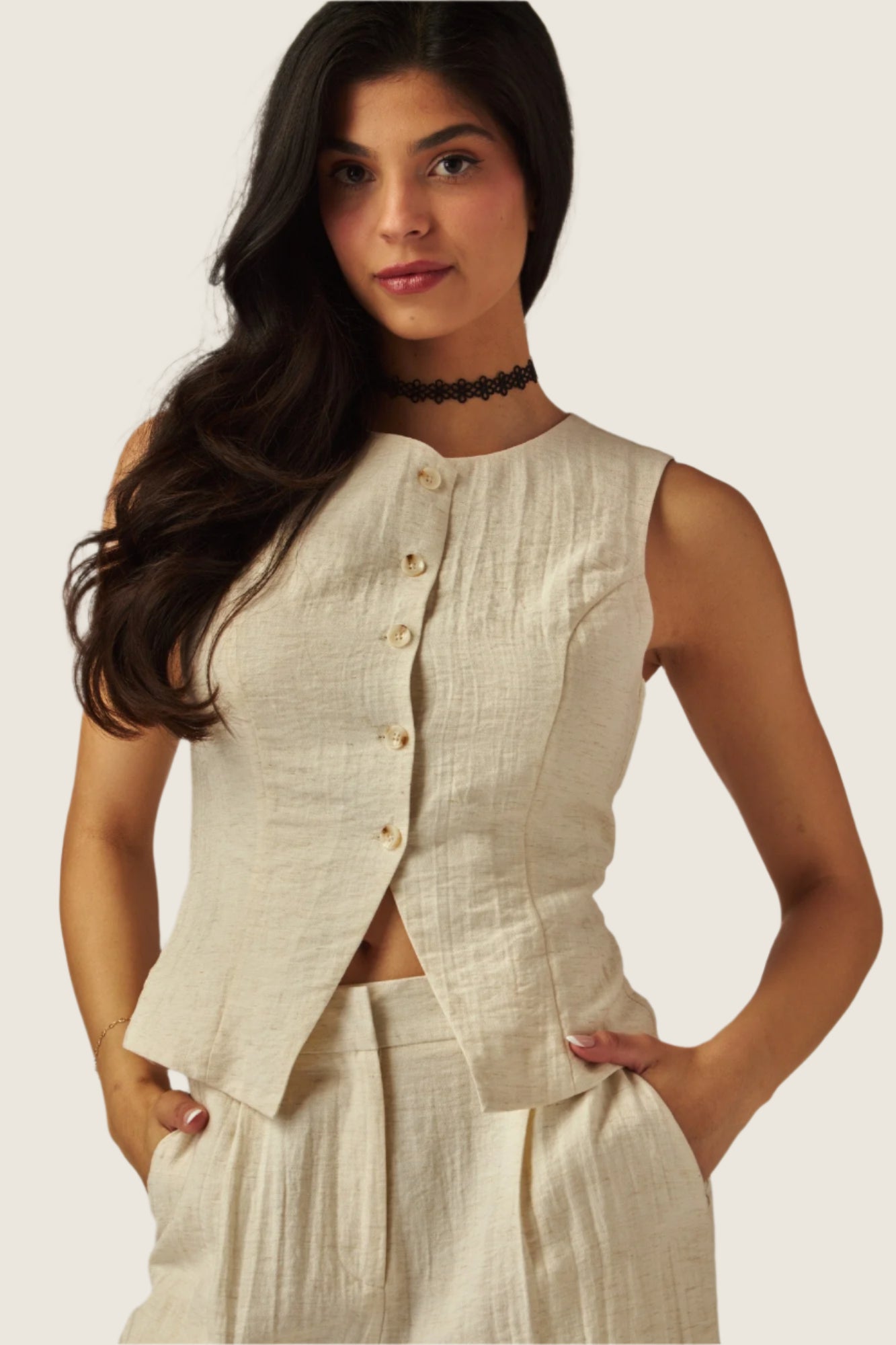 This is a button-up vest with princess seams for shaping. It's expertly tailored with soft, drapey fabric that combines airy linen with rayon.