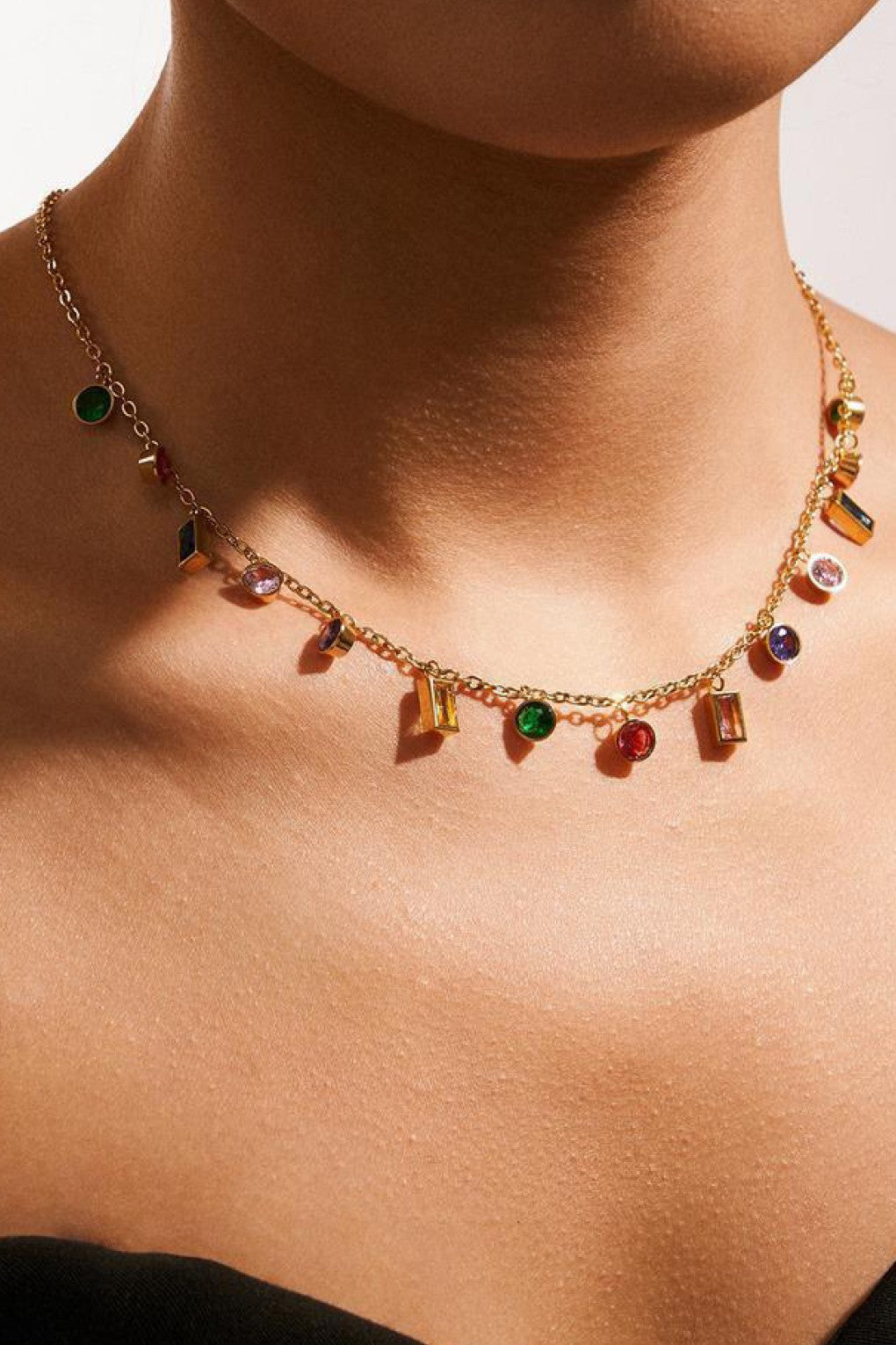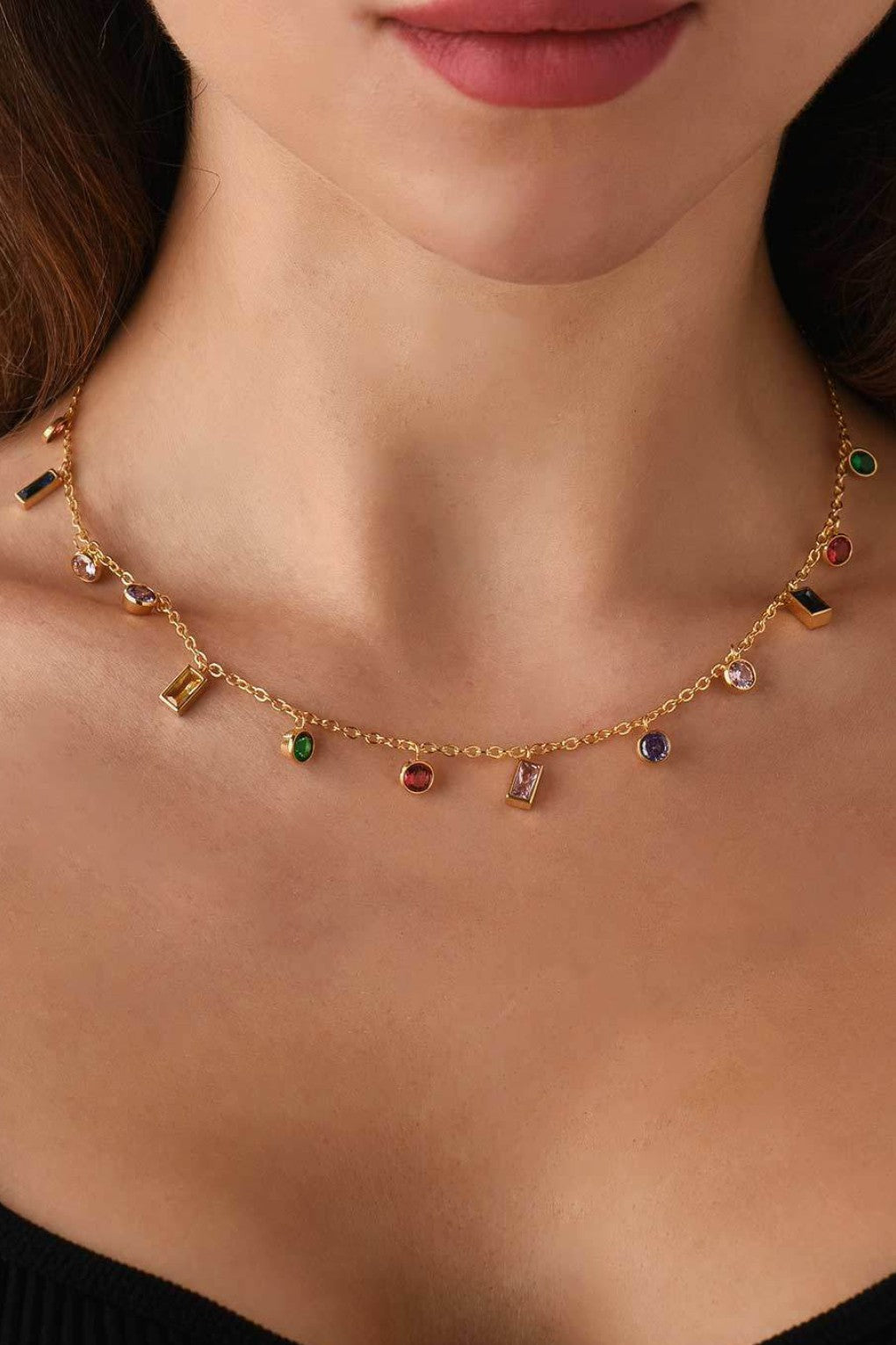18K Gold Dipped Stainless Steel Dainty Chain Necklace with Crystal Charms. The necklace is hypoallergenic, waterproof, fade-resistant, and tarnish-free, ensuring its beauty lasts for years. Perfect for everyday wear or special occasions.