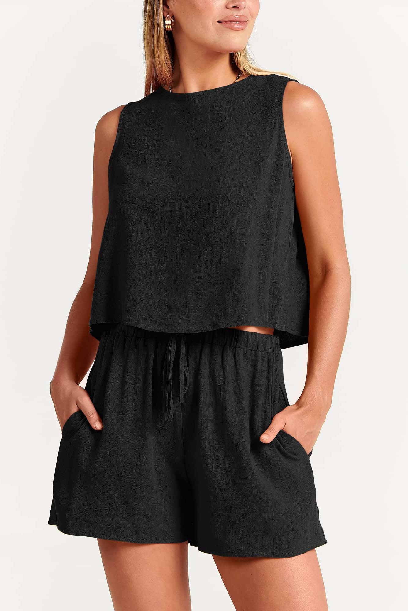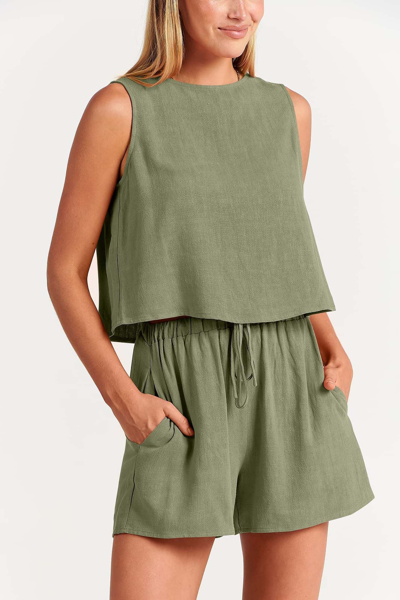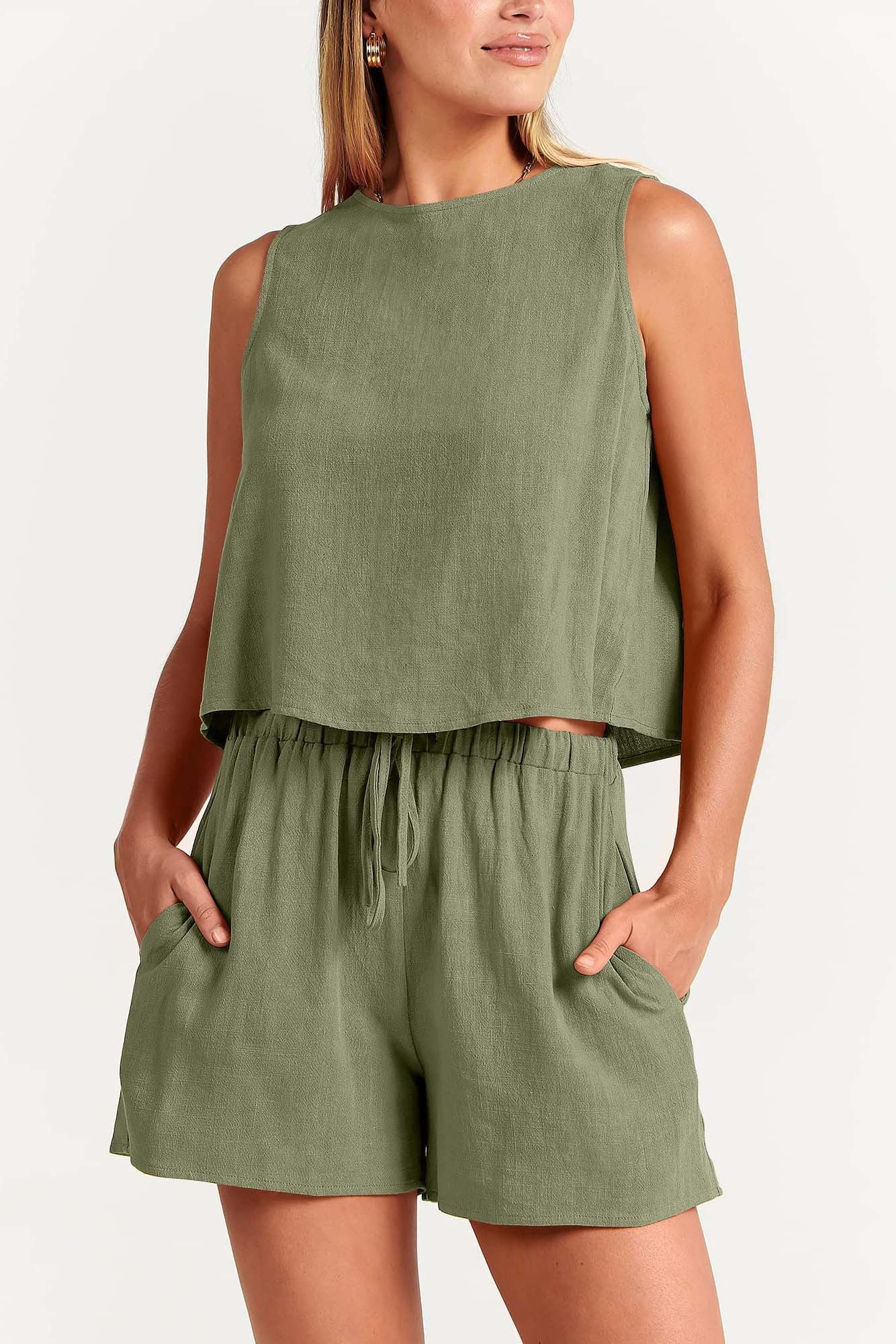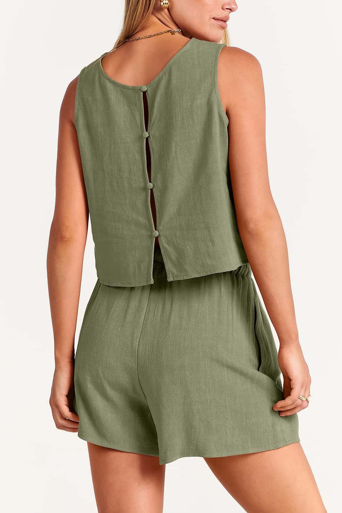 Made of linen and rayon, is soft, lightweight, and breathable, ensuring that you stay cool and comfortable in hot weather. Back button closure, crew neck, sleeveles, crop tank top, elastic waist shorts, side pockets, designed for comfort and style. The cute and comfy 2 piece shorts set suitable for Everyday Casual Wear/ Travelling/ Homewear / Vacation/ Outdoor Activity/Don't miss out on this must-have set outfit!