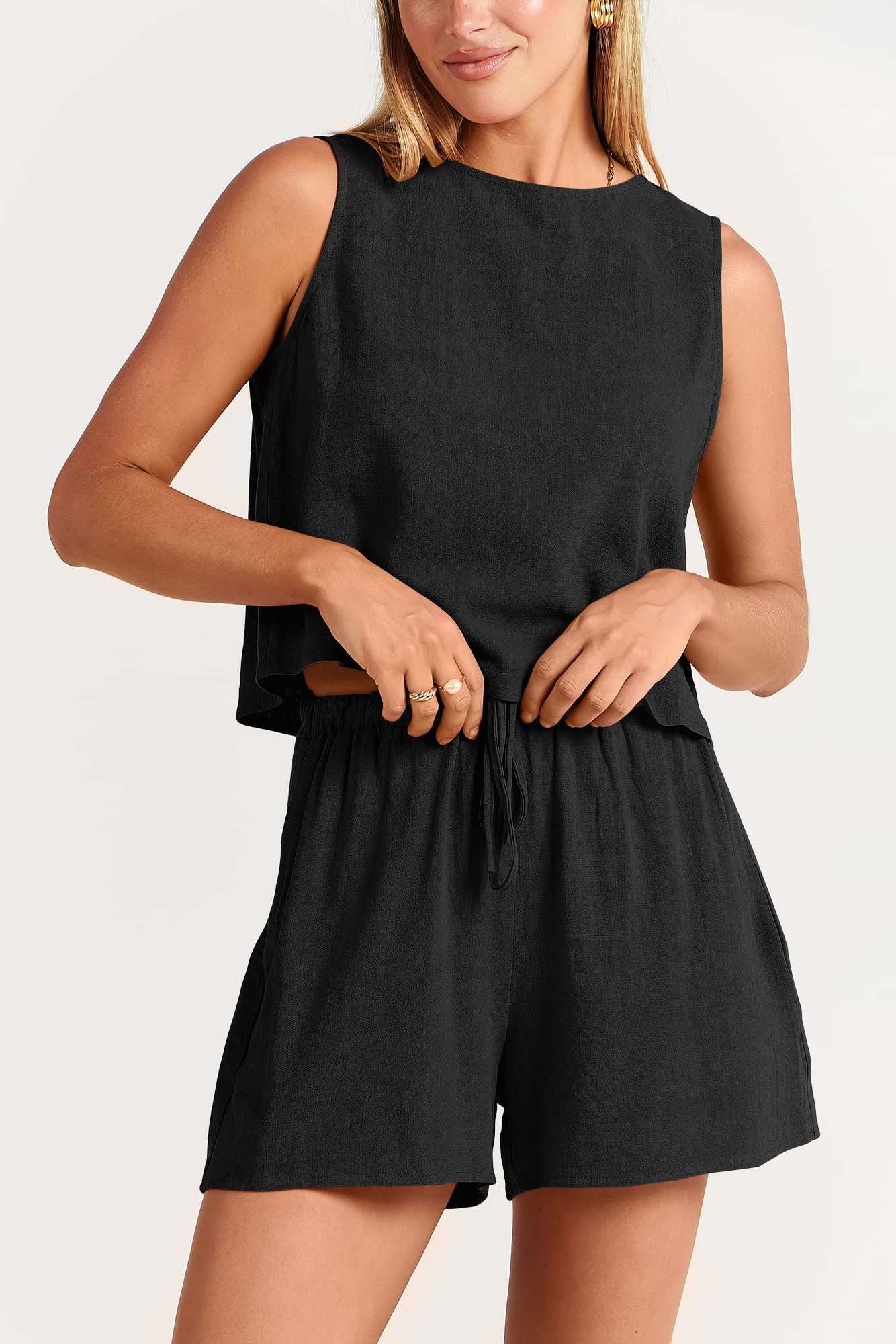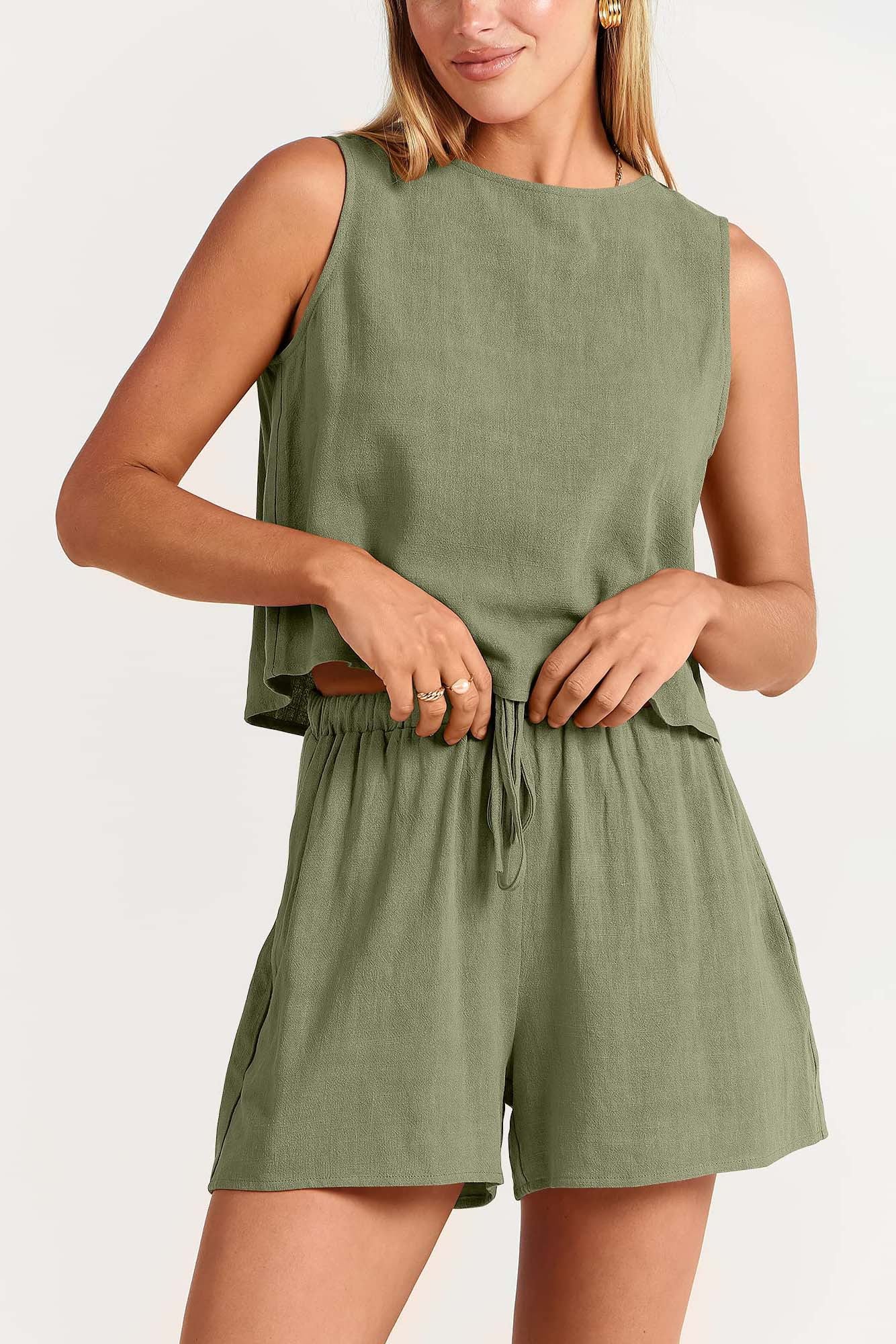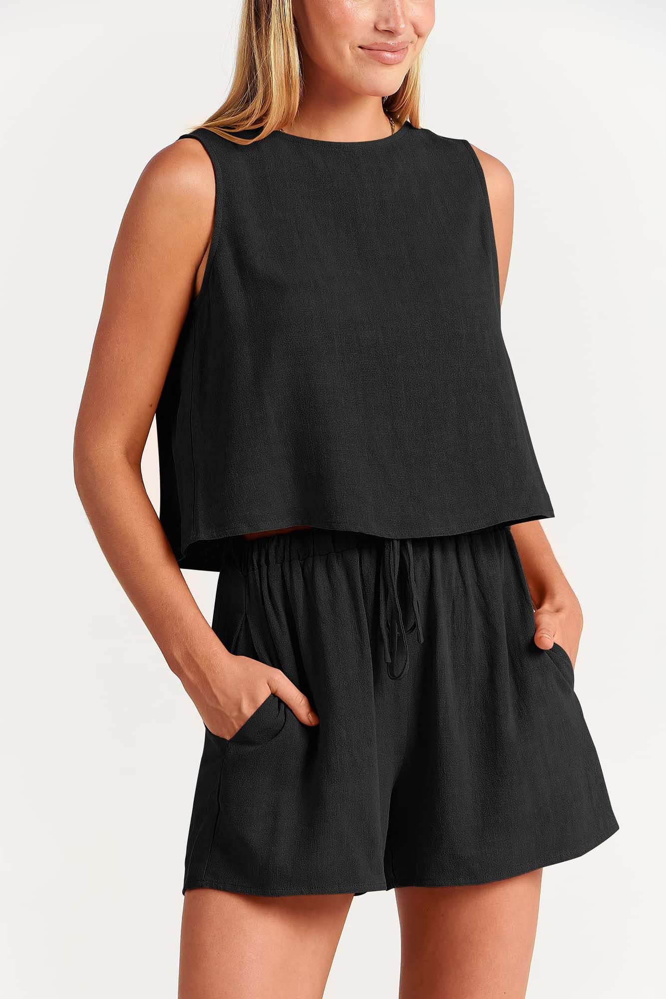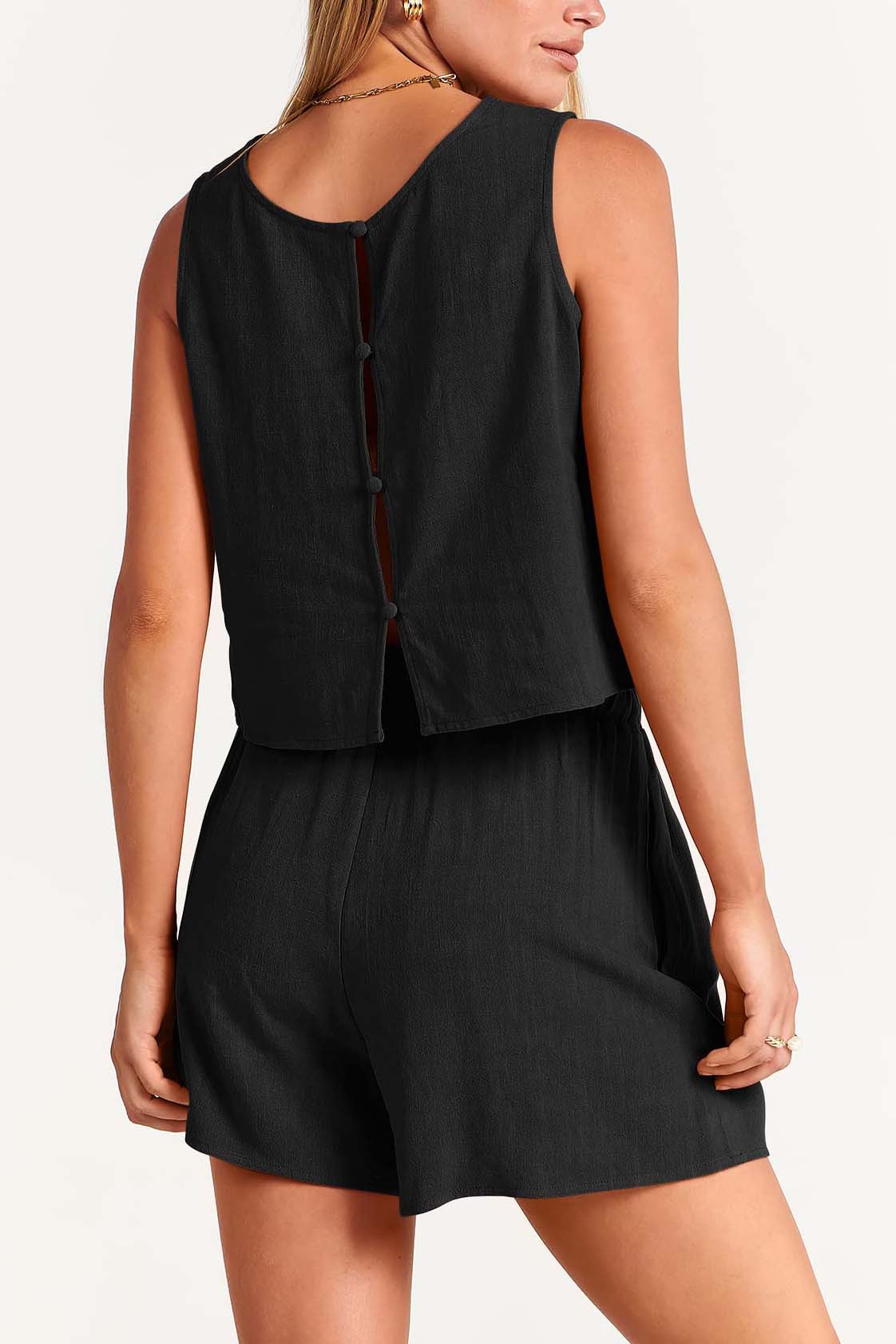 Made of linen and rayon, is soft, lightweight, and breathable, ensuring that you stay cool and comfortable in hot weather. Back button closure, crew neck, sleeveles, crop tank top, elastic waist shorts, side pockets, designed for comfort and style. The cute and comfy 2 piece shorts set suitable for Everyday Casual Wear/ Travelling/ Homewear / Vacation/ Outdoor Activity/Don't miss out on this must-have set outfit!