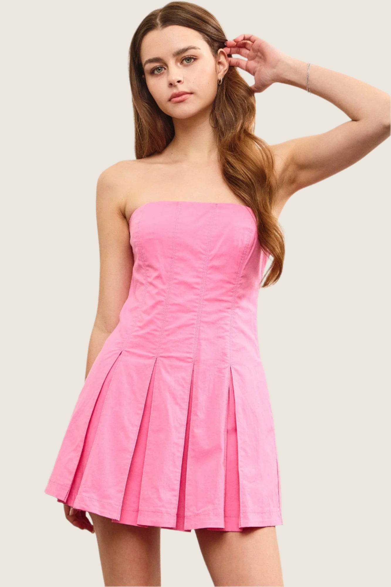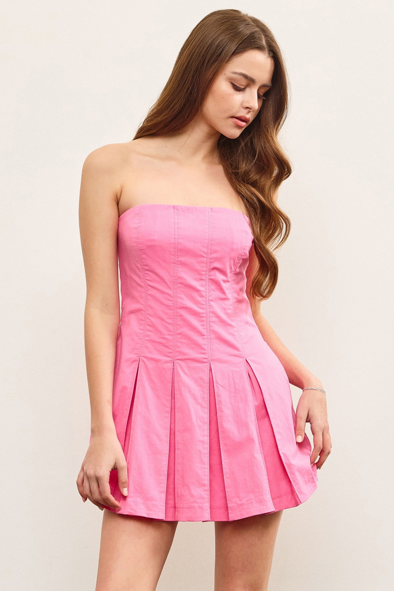 This playful pink dress combines a strapless tube top with a soft denim fabric and a flirty pleated skirt. The mini length keeps it fun and fresh, while the hidden shorts lining adds comfort and confidence for all your adventures. Perfect for sunny days and spontaneous outings!