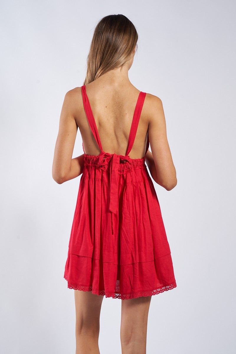 Linen Solid Color Sweetheart Neck Sleeveless Adjustable Tie Wide Strap Embroidered Point Lace Trim Swing Ruffle Mini Dress SELF:80%LINEN/20%COTTON LINING:100%POLY