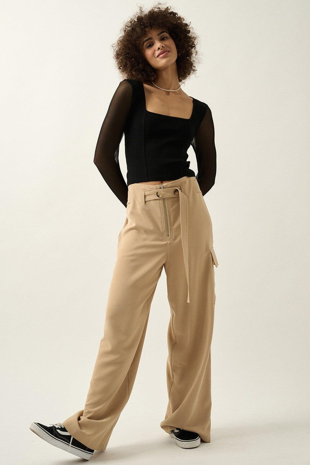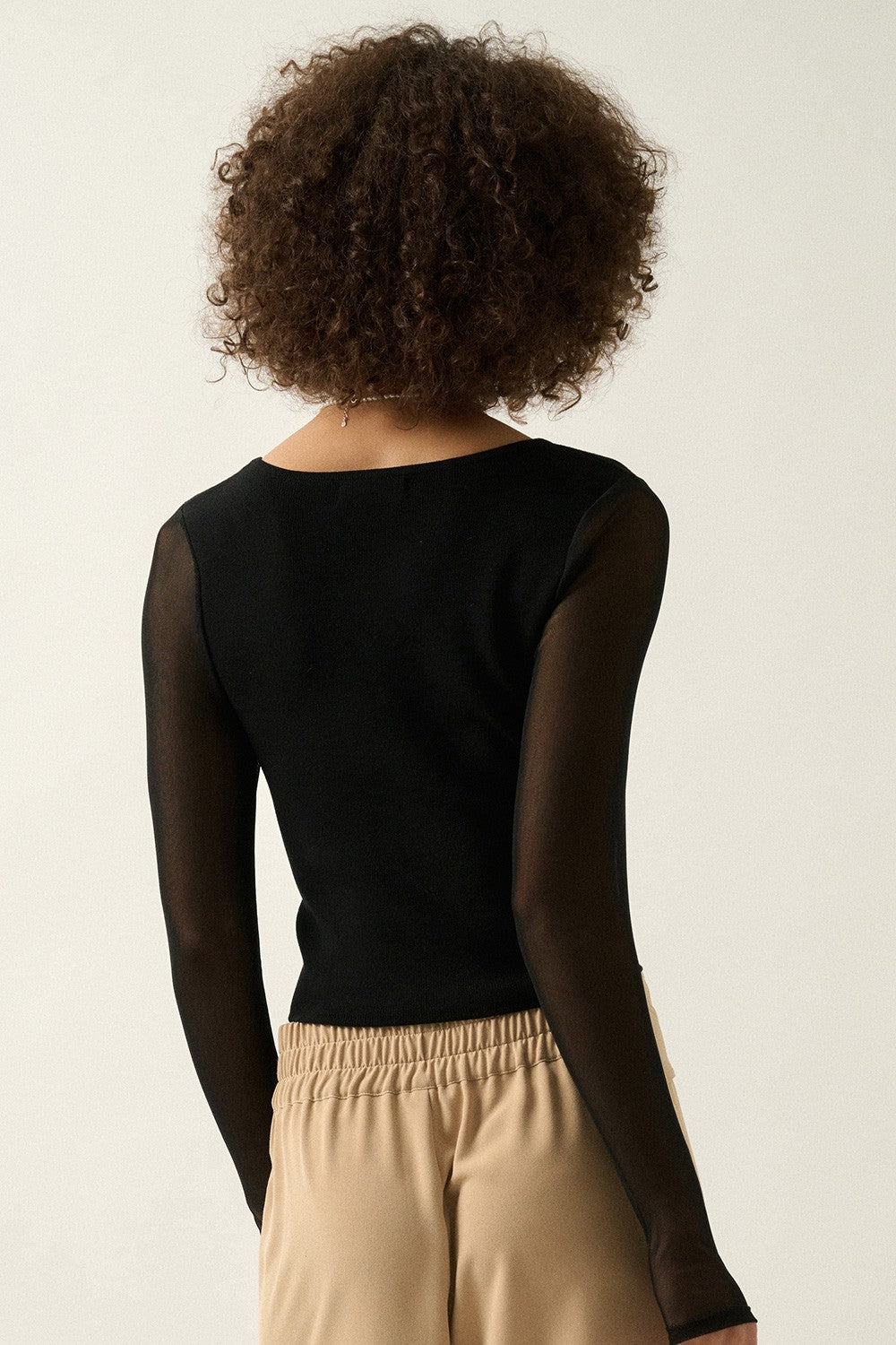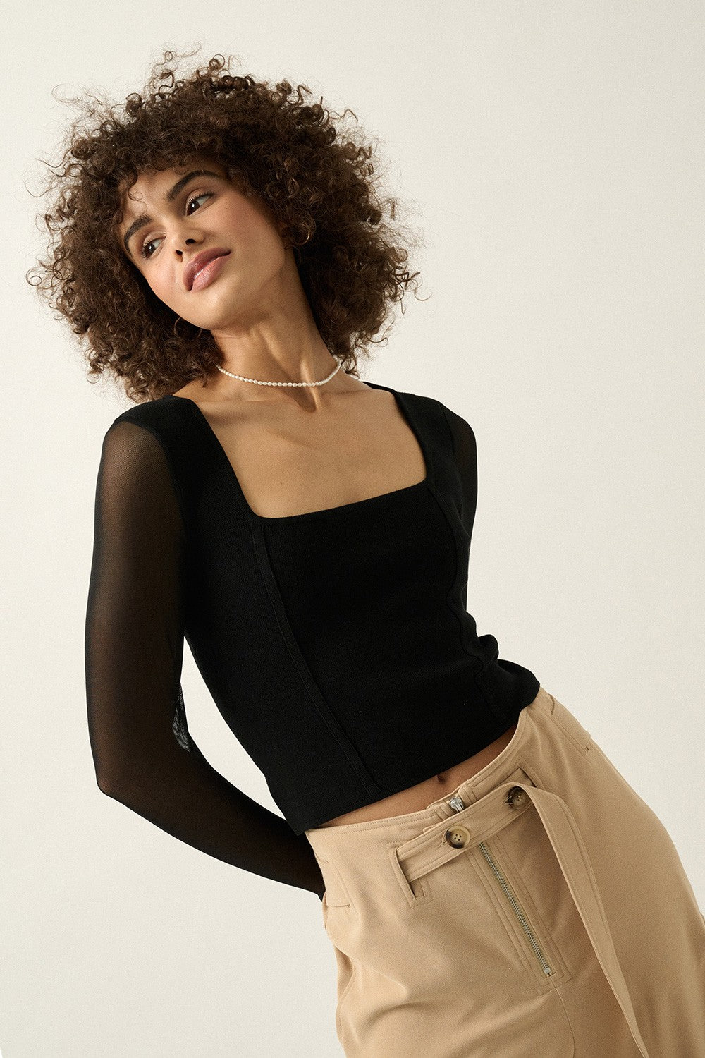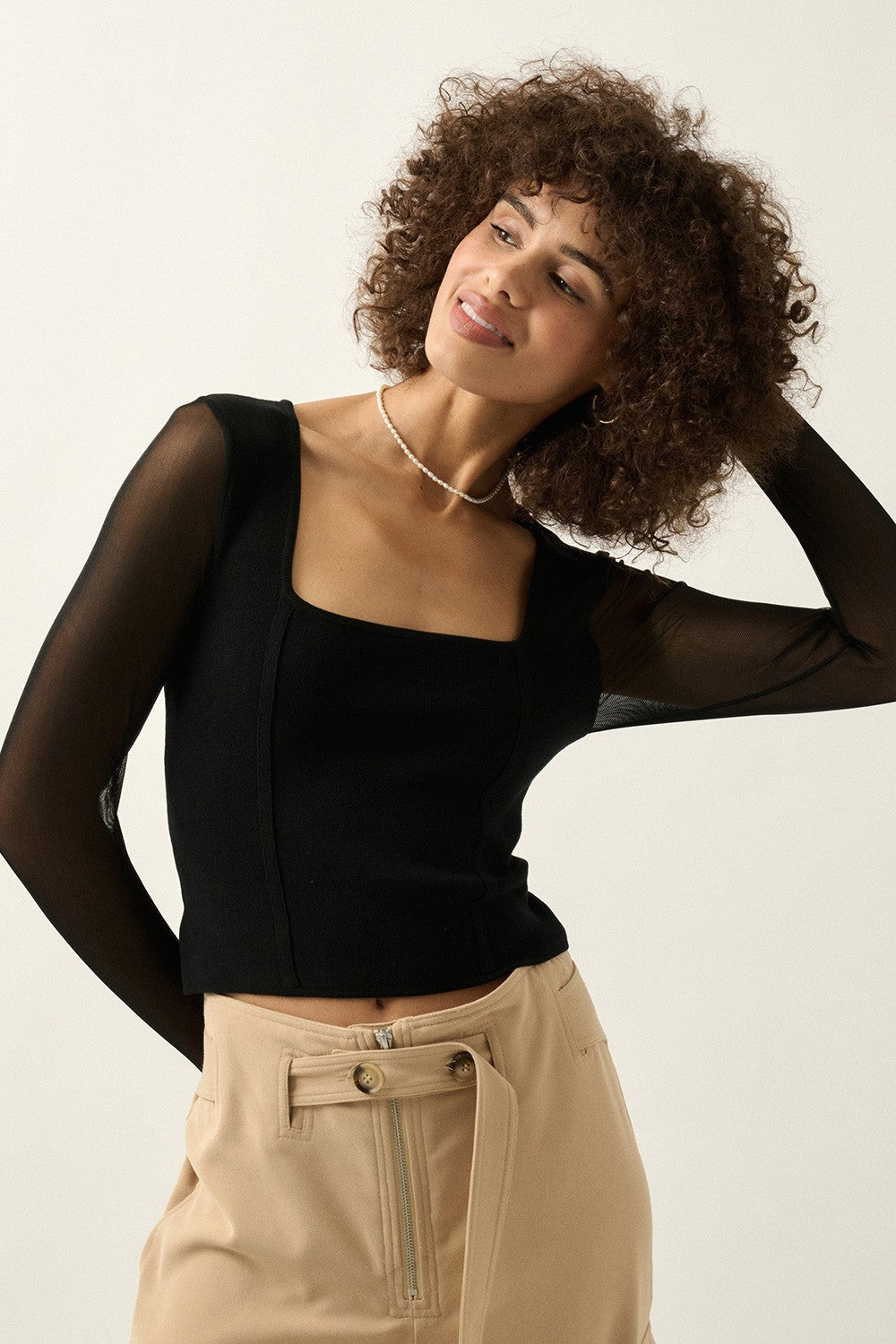 A solid, knit top with the following features: Square neckline. Long sheer sleeves with thumb holes. Trim detail along bodice. Cropped length. Fitted silhouette. Lifted Fit styles feature premium stretch fabric with a lightweight feel and supportive fit.