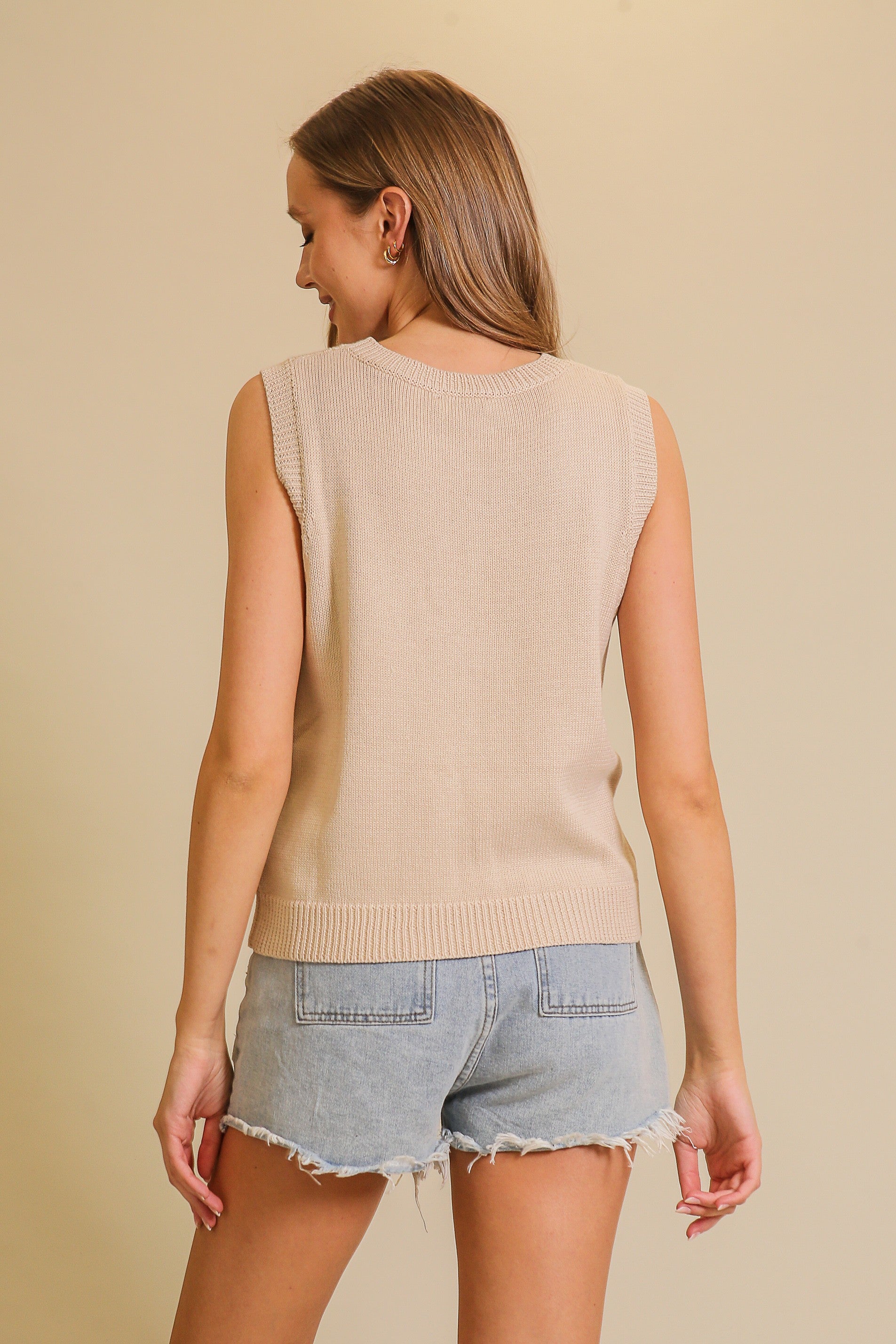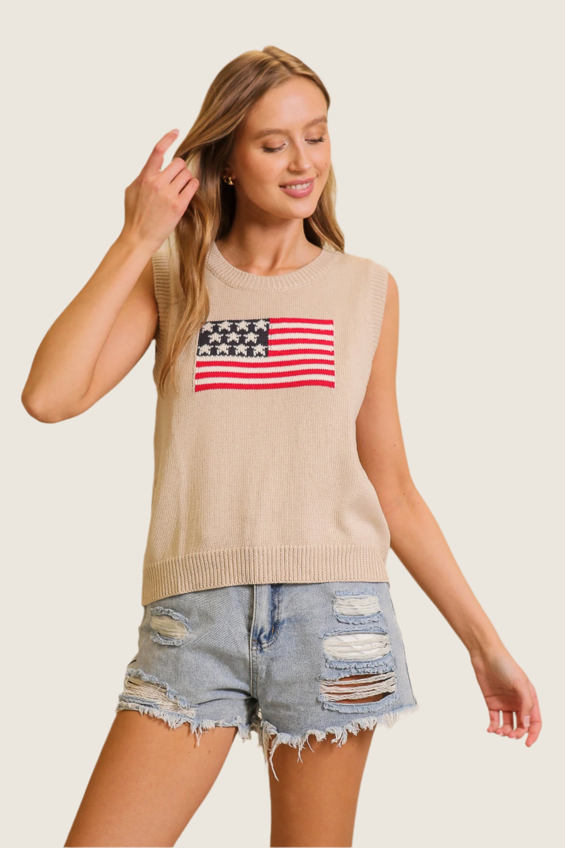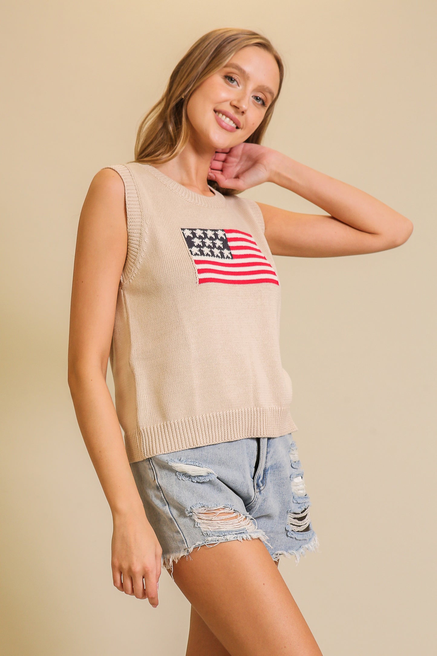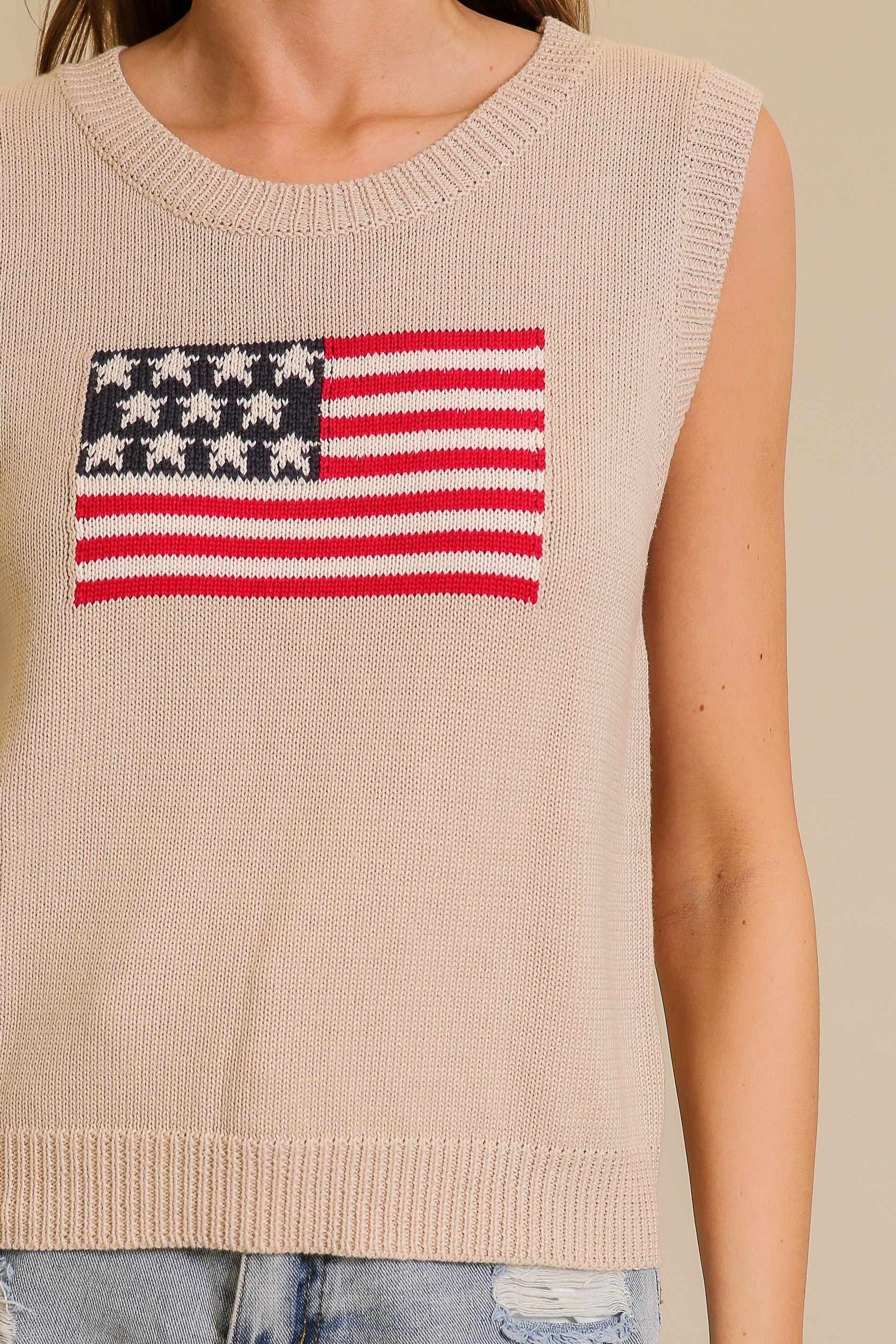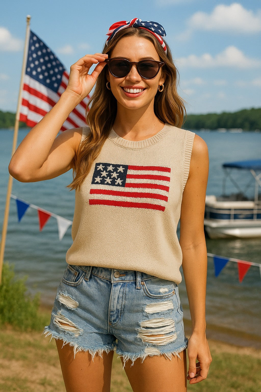 Sleeveless Beige Knit Sweater, featuring a American flag design. This versatile piece combines classic style with a touch of festive vibes, perfect for layering or wearing on its own.