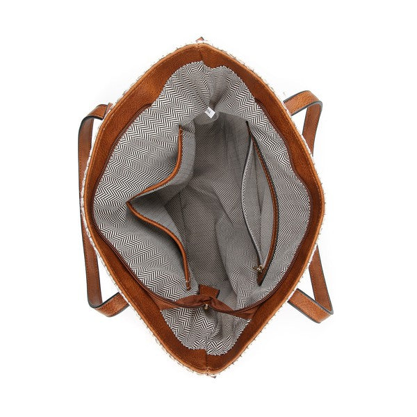 Mid-sized tote. It includes plenty of pocket space inside and zips closed for extra protection. Carry it with the handles or use the adjustable/removable crossbody strap! Made of woven material with vegan leather accents.
