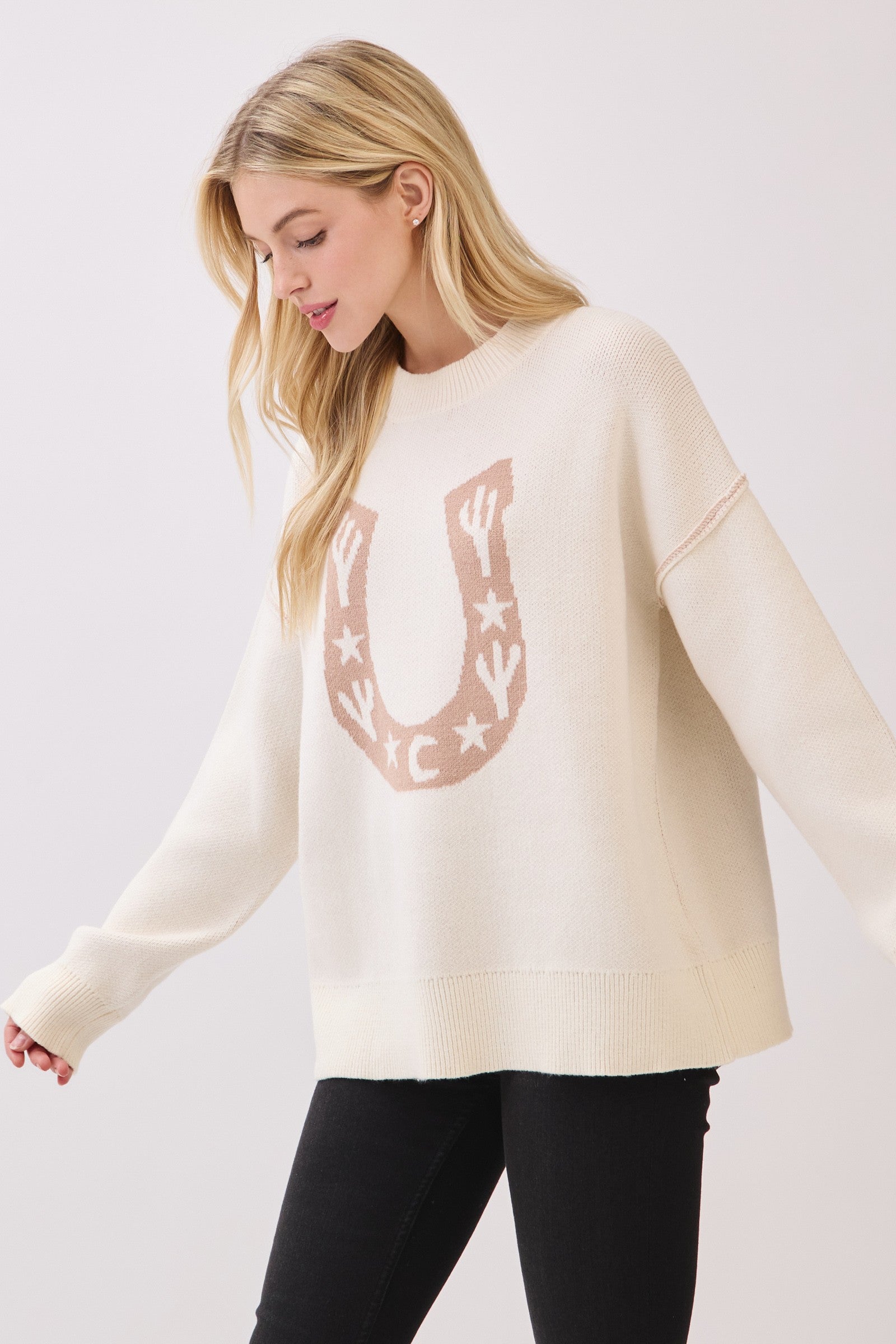 Channel cozy desert vibes with this cream knit sweater featuring a bold horseshoe graphic adorned with cacti and stars. Designed in a relaxed fit with dropped shoulders and ribbed trim, this western-inspired pullover adds charm and comfort to any casual look. Perfect for layering on cooler days or styling solo for standout streetwear appeal. western sweater, cactus sweater, horseshoe graphic knit, cream pullover, cozy knit top, desert vibes, cowgirl style, relaxed fit sweater, fall winter sweater, country chic, soft knitwear, casual layering top, trendy knit sweater, fashiongo best seller, boutique sweater