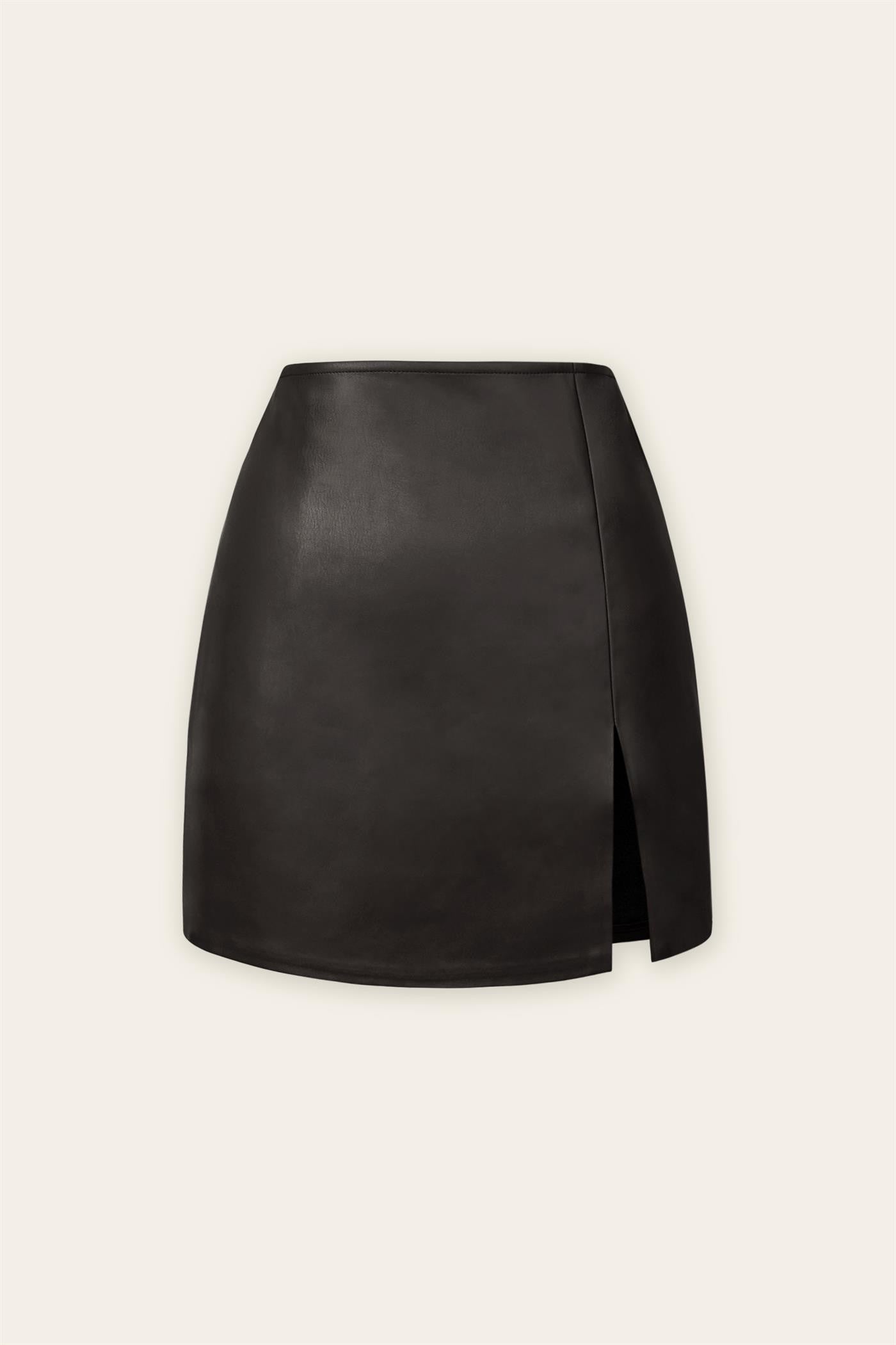 Faux leather mini skirt with a skit detail. Model is 5'8" and wearing size Small. - Flattering A-line shape - Side slit - Zip-back closure - Lined Shell: 55% Polyester, 45% Polyurethane Lining: N/A Contrast: 90% Polyester, 10% Spandex