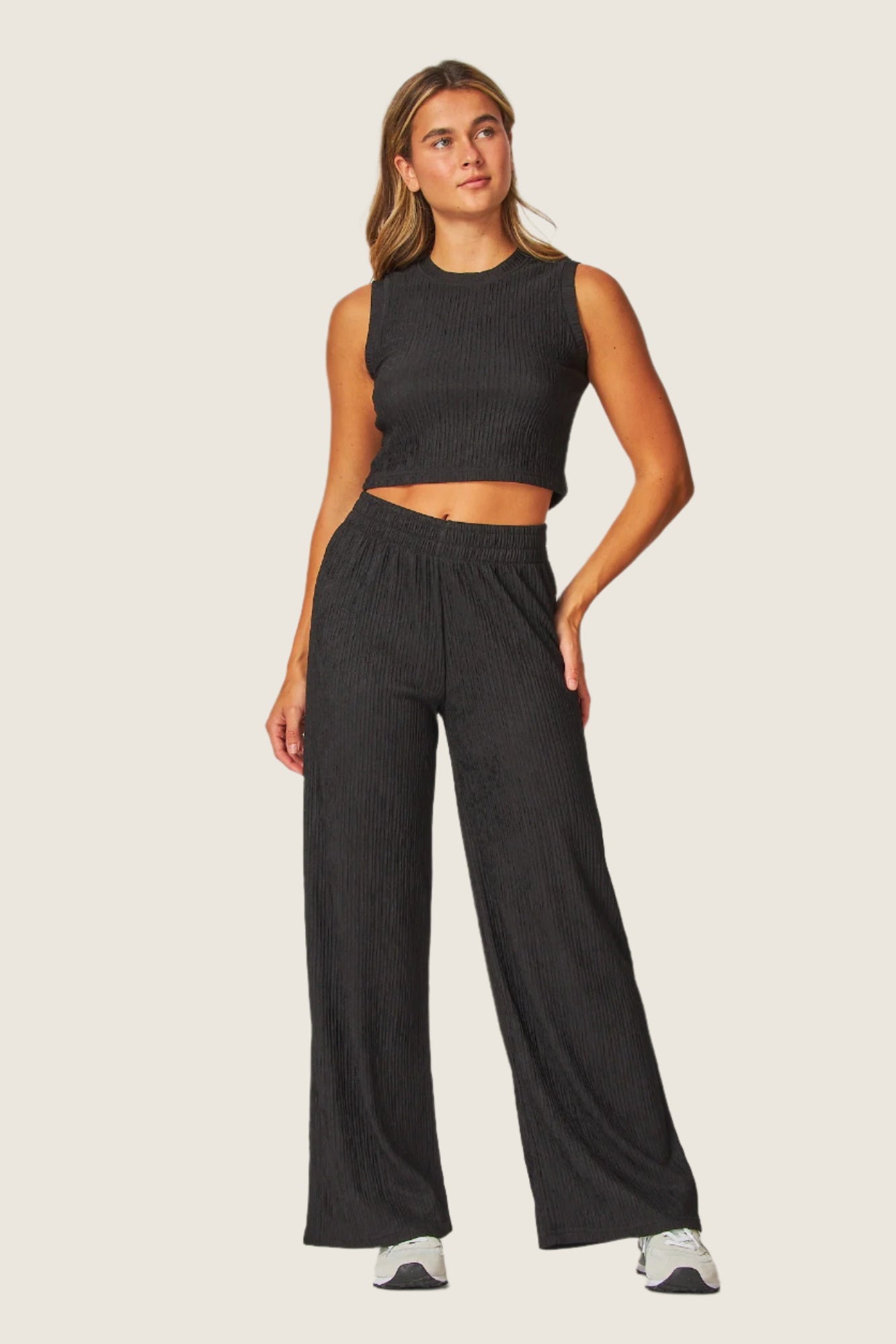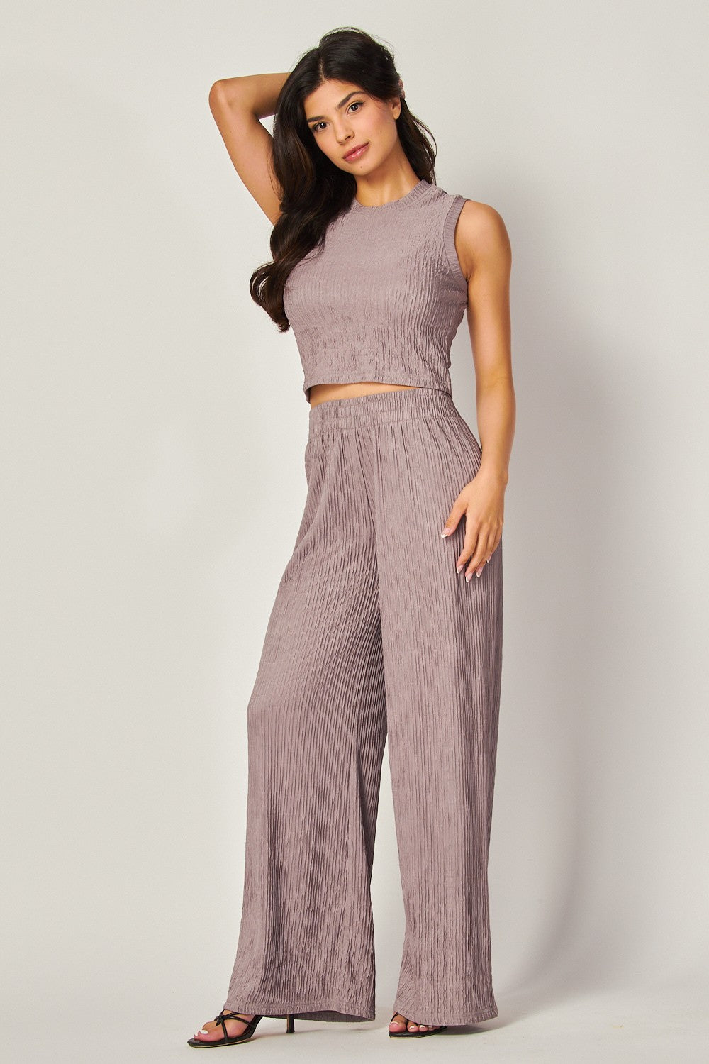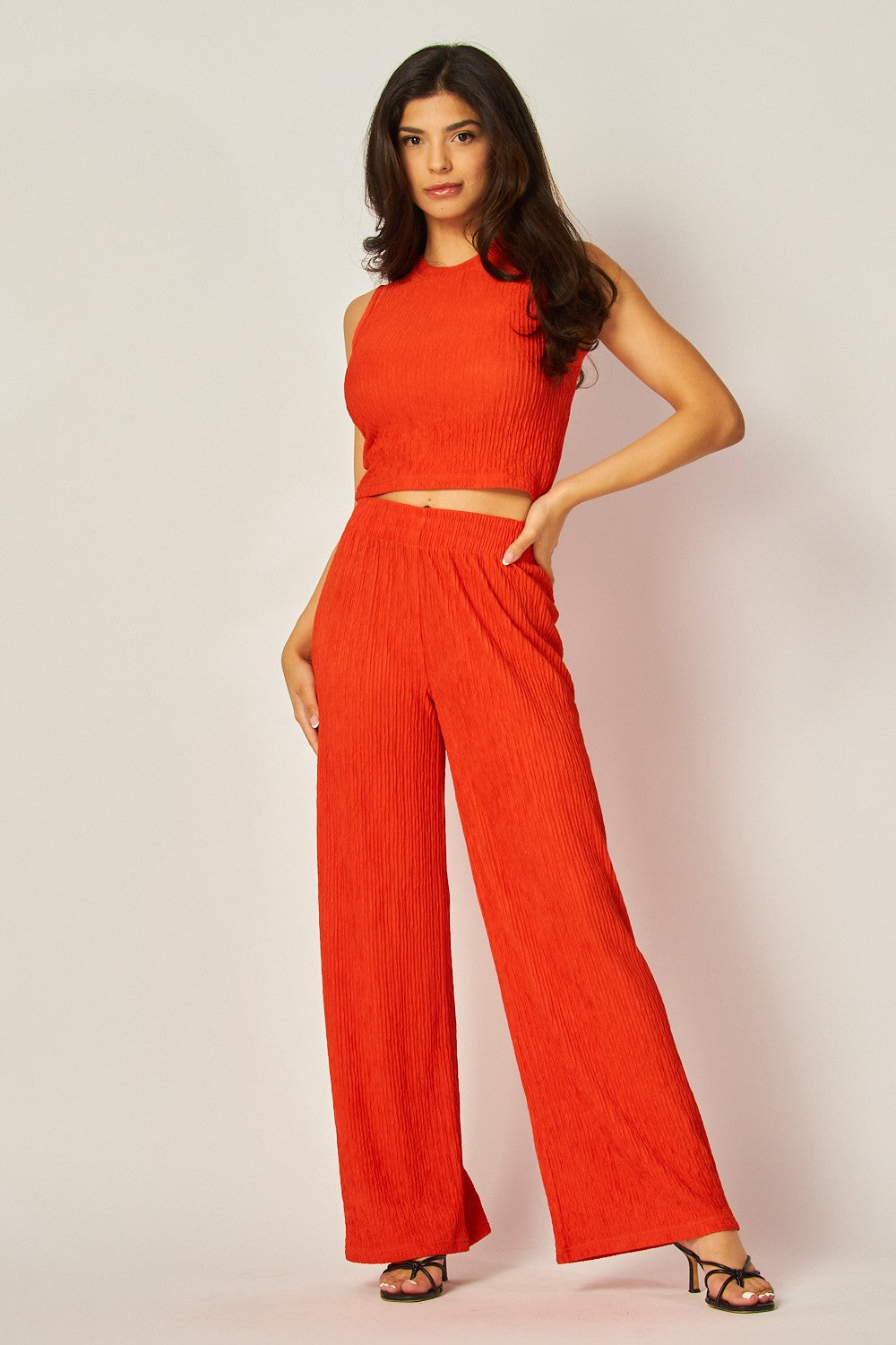 This crinkled textured sleeveless cropped top set in a gorgeous color is the epitome of versatile chic. The unique crinkled texture adds a stylish dimension to the set, while the sleeveless cropped top offers a relaxed yet flattering fit. Perfect for lounging, this set can easily be dressed up with accessories and heels for a night out or dressed down with sneakers for a laid-back look.