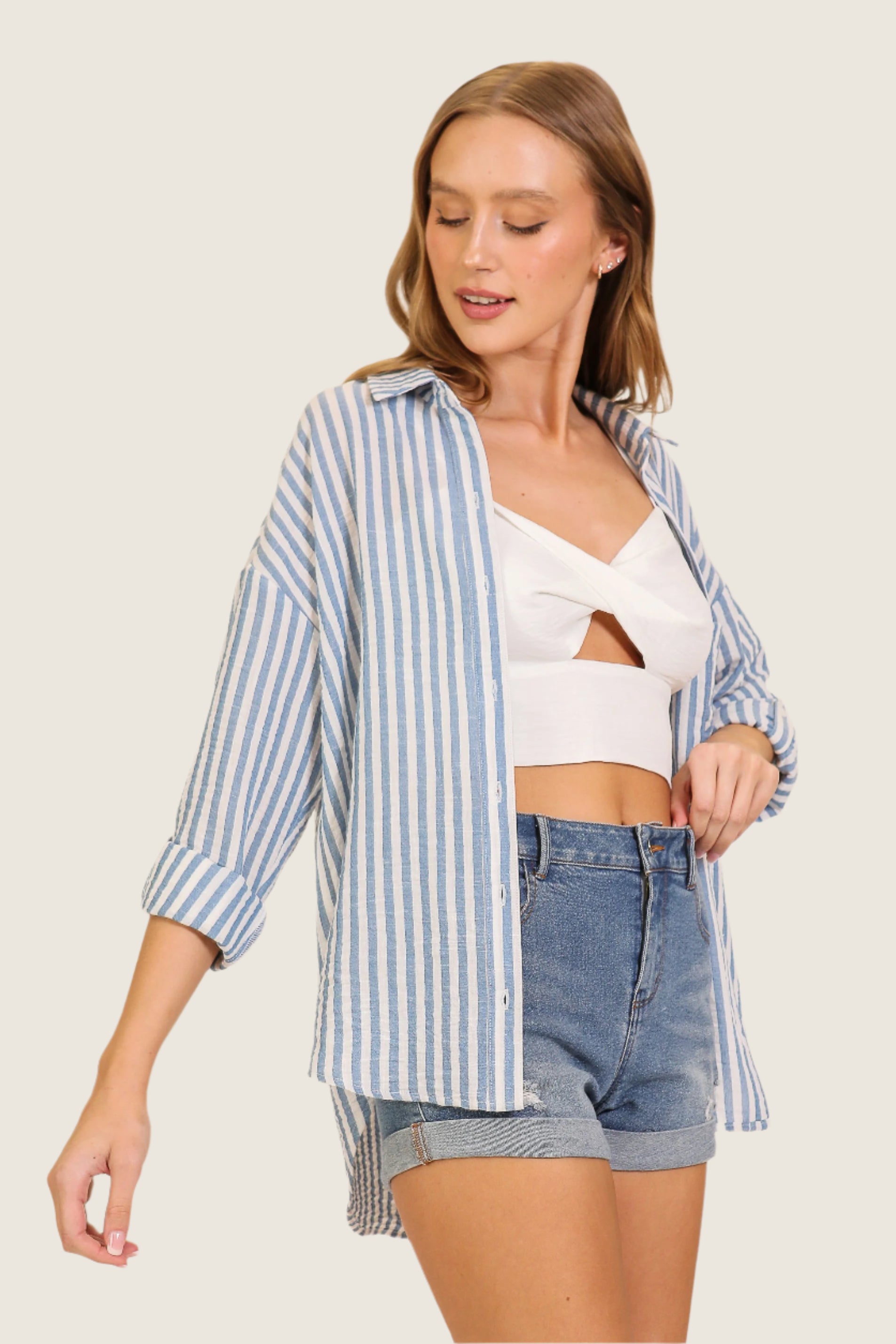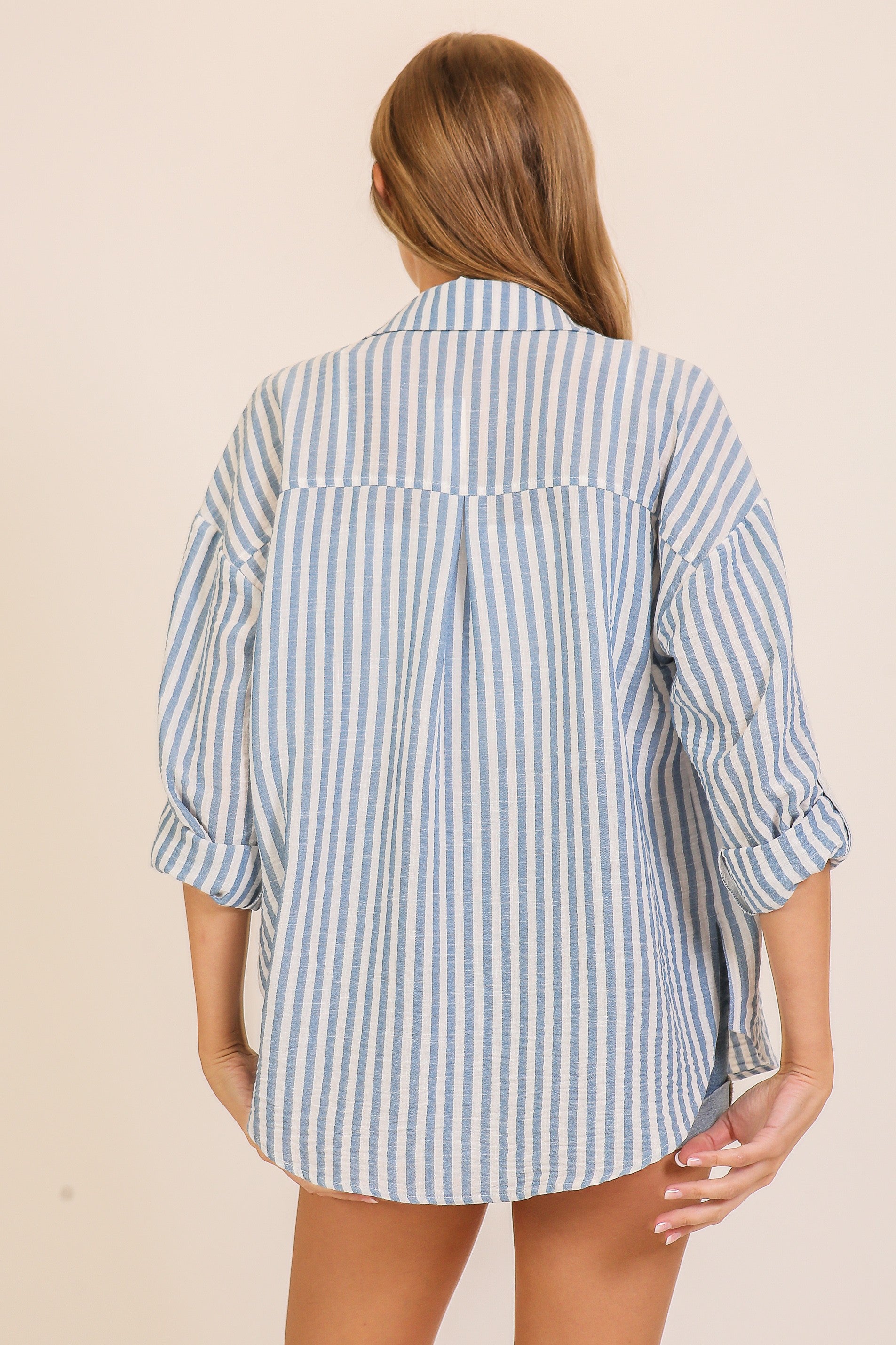 A timeless wardrobe staple, this lightweight striped button-down shirt is designed for effortless layering and versatile styling. Featuring a relaxed fit and breathable fabric, this piece is perfect for breezy beach days or casual outings. The classic vertical stripes add a touch of sophistication, while the 3/4 roll-up sleeves offer a laid-back, effortless vibe.