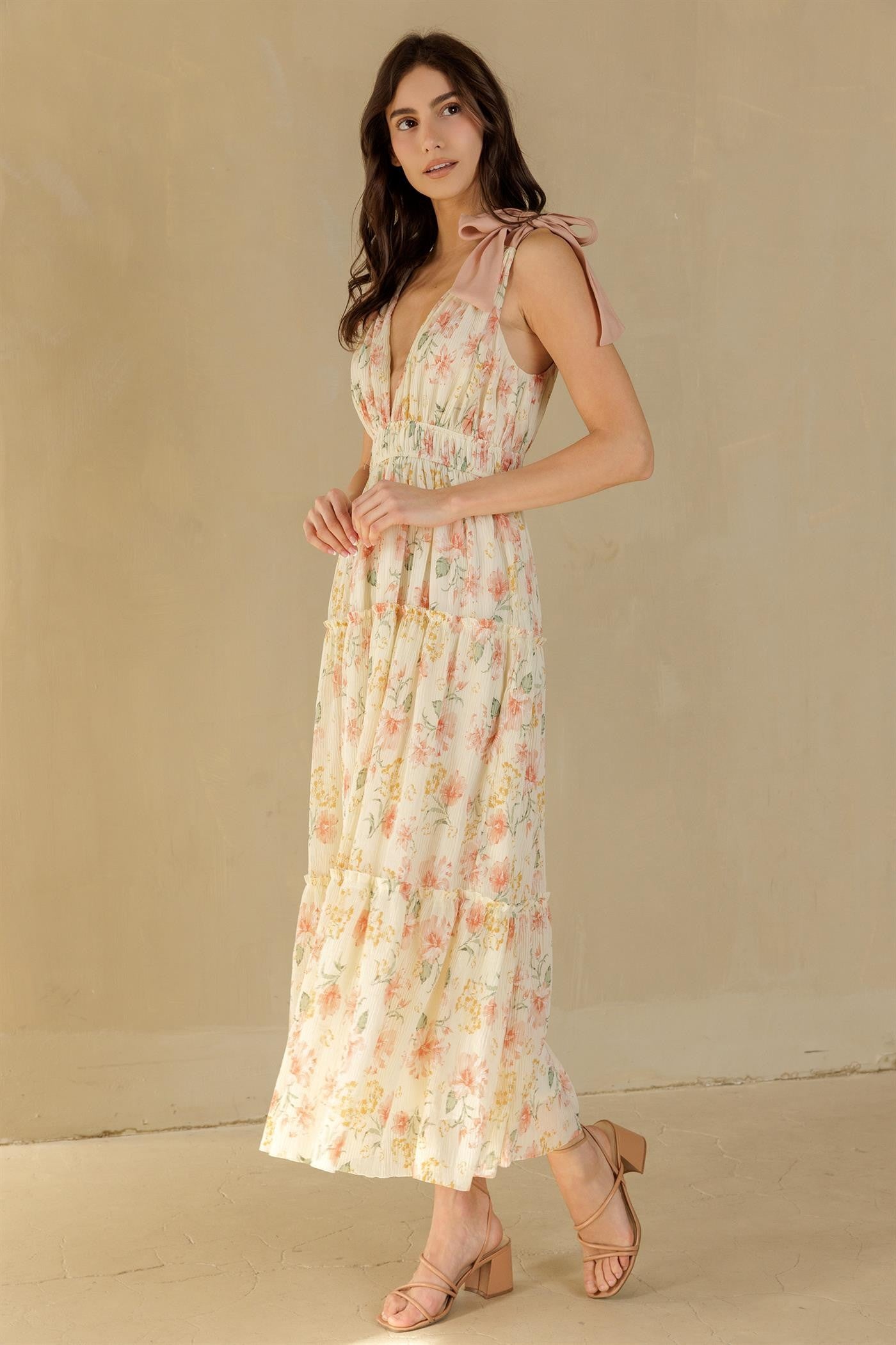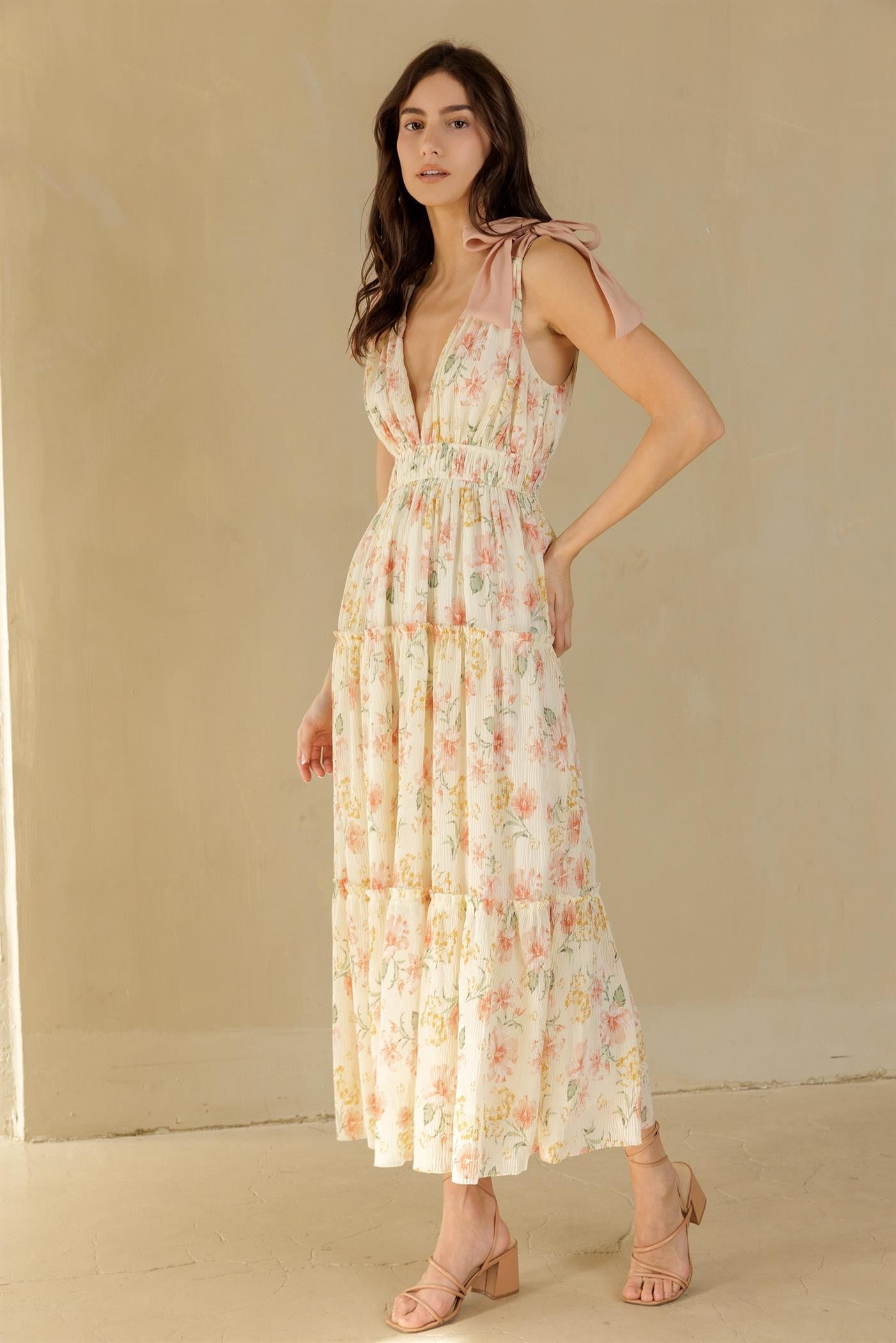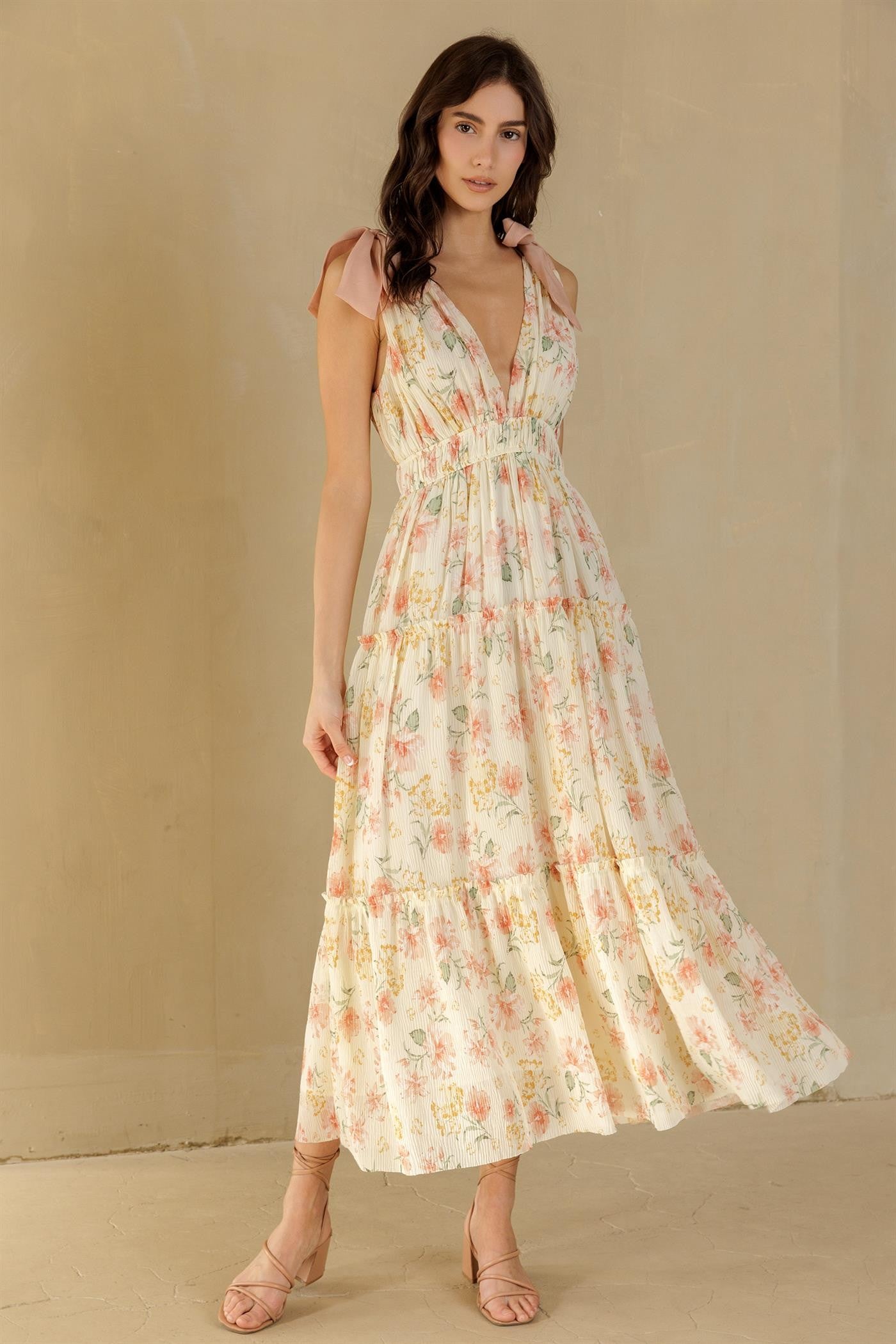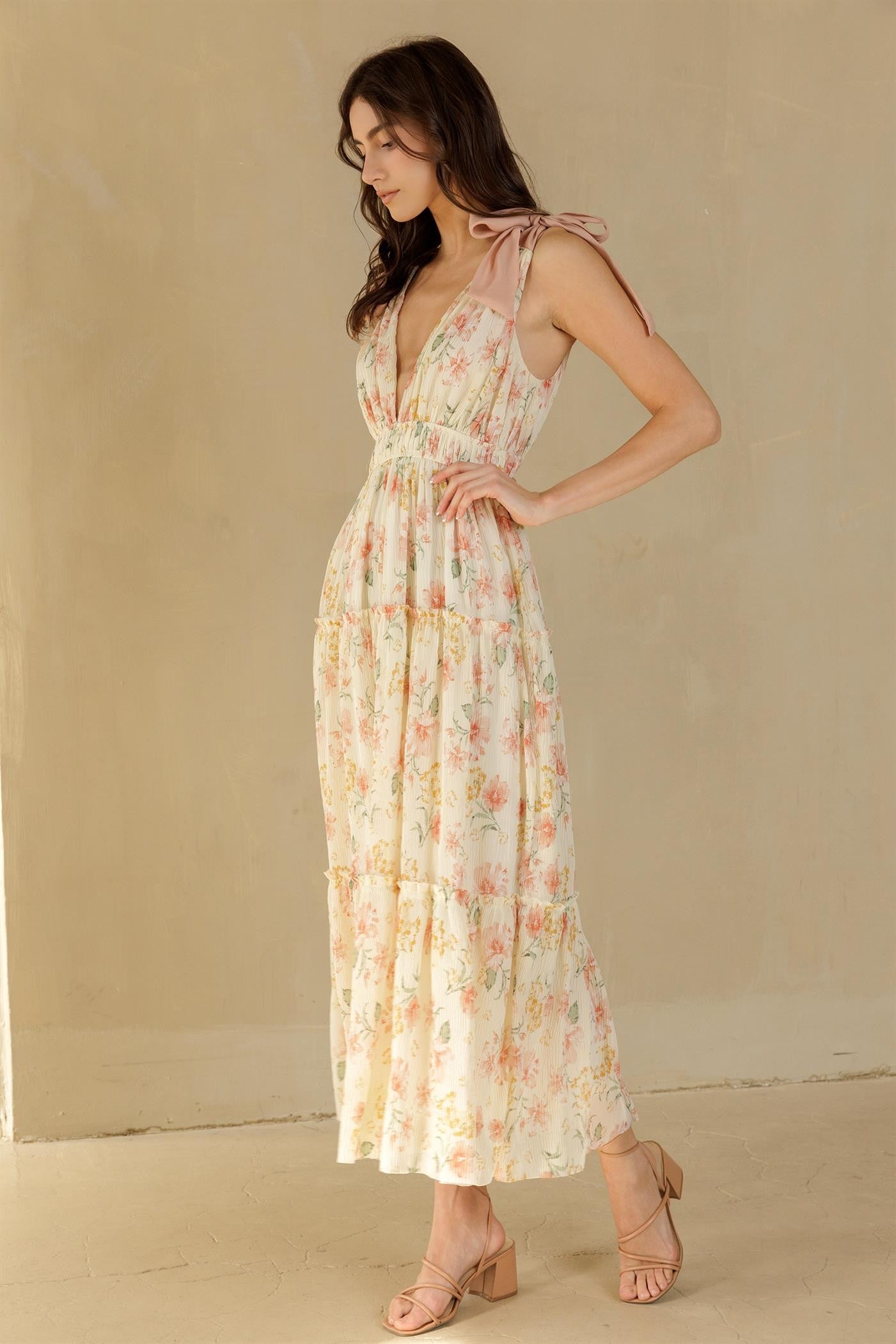 This maxi dress features a delicate floral print in soft coral and cream tones, perfect for spring and summer. The pleated bodice highlights a plunging neckline and is adorned with charming bow-tie straps. An elasticized waistband ensures a comfortable and flattering fit, while the tiered skirt cascades gracefully, creating a flowy silhouette. The open-back detail adds a hint of allure, making this dress an ideal choice for garden weddings, outdoor parties, or casual strolls under the sun.