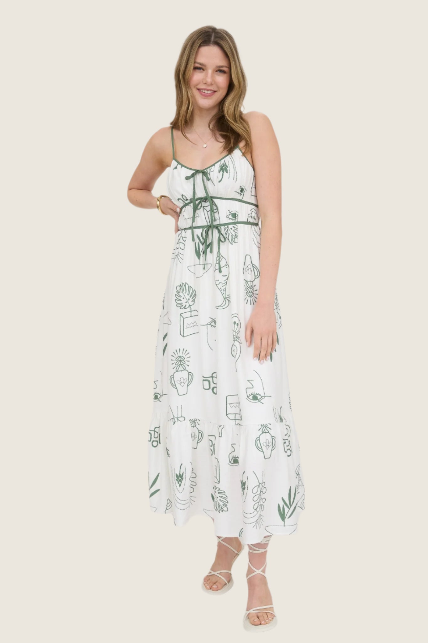 Embrace a playful vibe with this white and green doodle print midi dress. Featuring charming front ties and a flattering midi length, it’s perfect for adding a fun, artistic touch to your wardrobe. Light and breezy, this linen blend dress effortlessly combines comfort with a whimsical style.