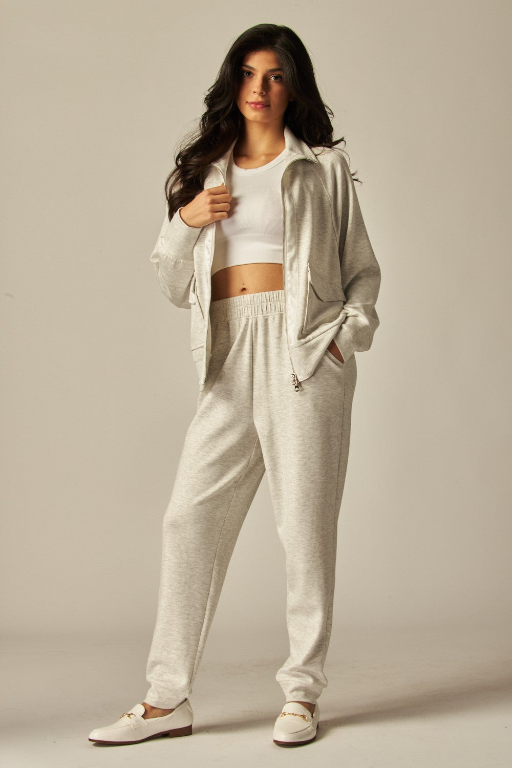 Introducing the sateen-trimmed zip-through sweat in our Double Soft fabric that pairs perfectly with slim cuffed pants. Features a high funnel neck, raglan sleeves and front patch pockets. Cut for a relaxed fit, this zip-through sweat is a versatile addition to your year-round wardrobe. And the pants boast a slim, tailored fit that flatters your figure and a cuffed hem that adds a touch of sophistication. They are the ultimate combination of comfort and elegance.