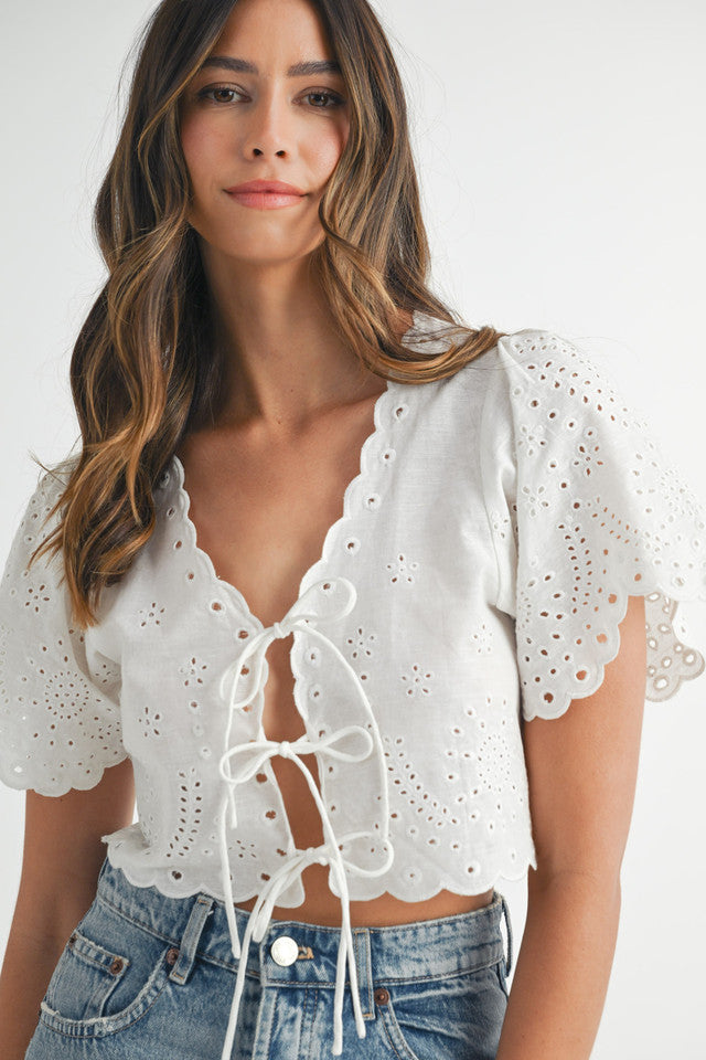 Linen Embroidered Eyelet Top features delicate eyelet details, short puff sleeves, scalloped hem and double self-tie.