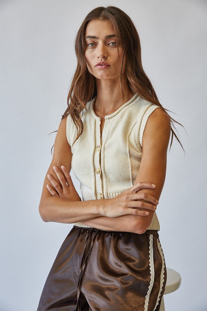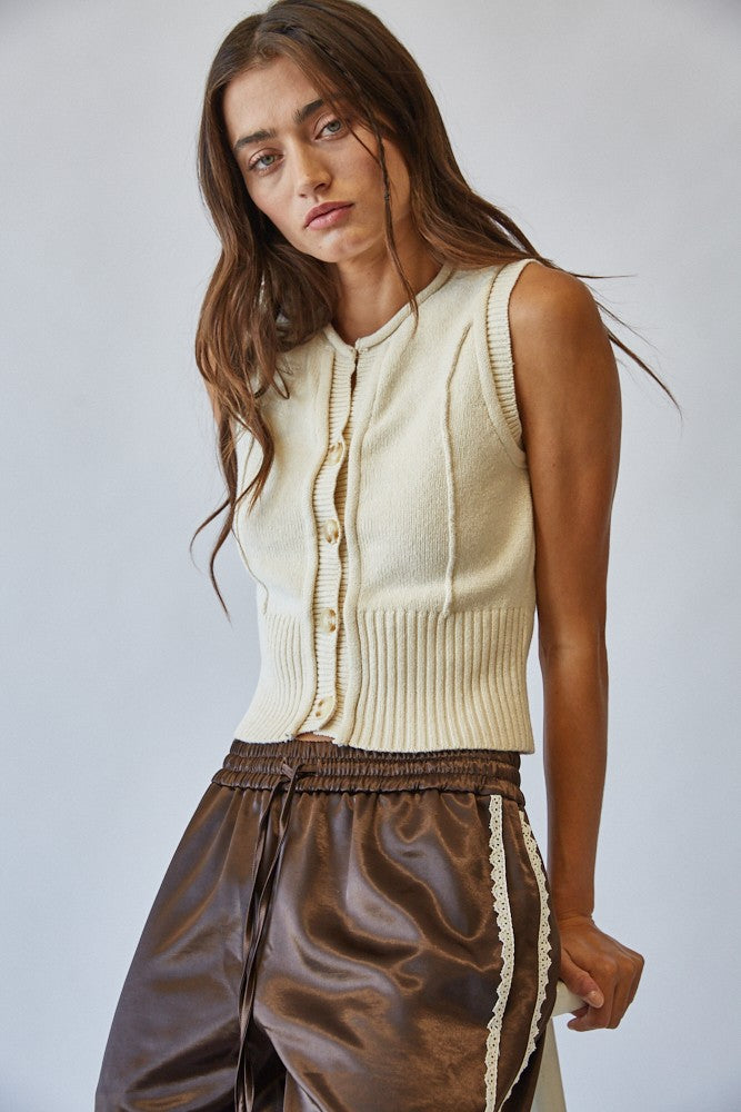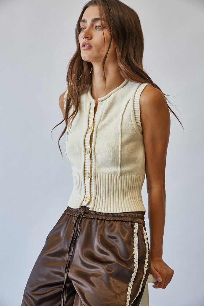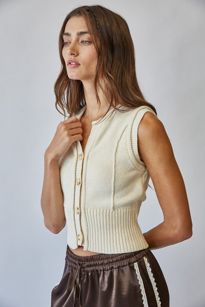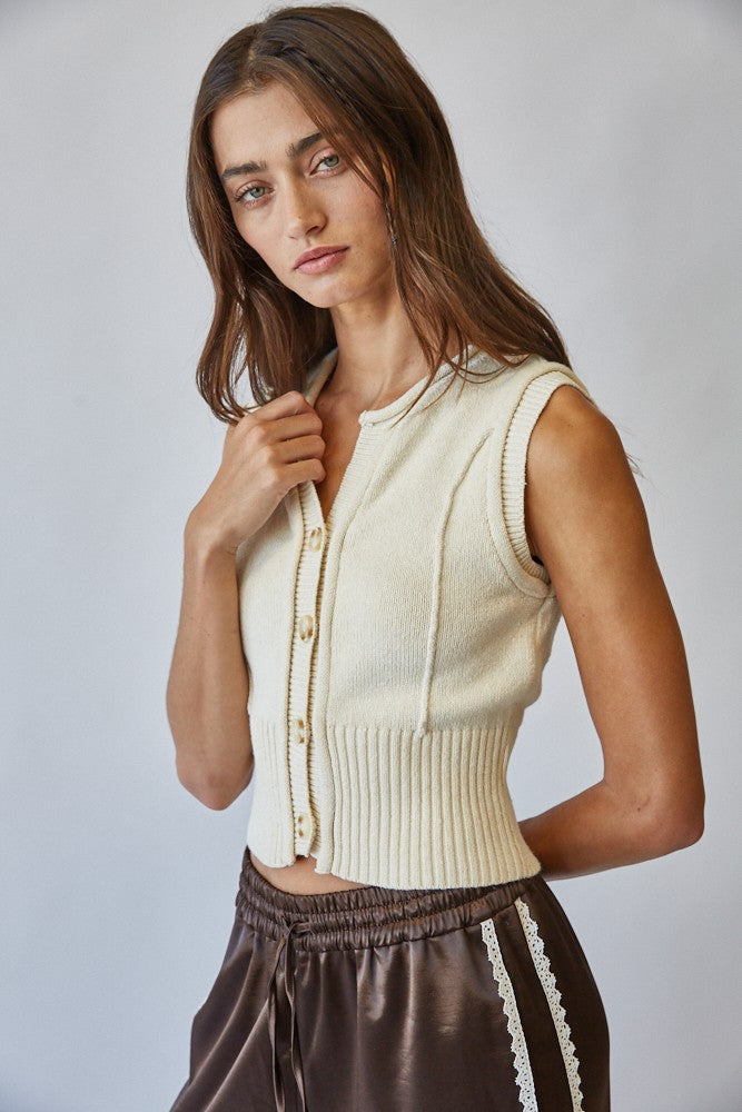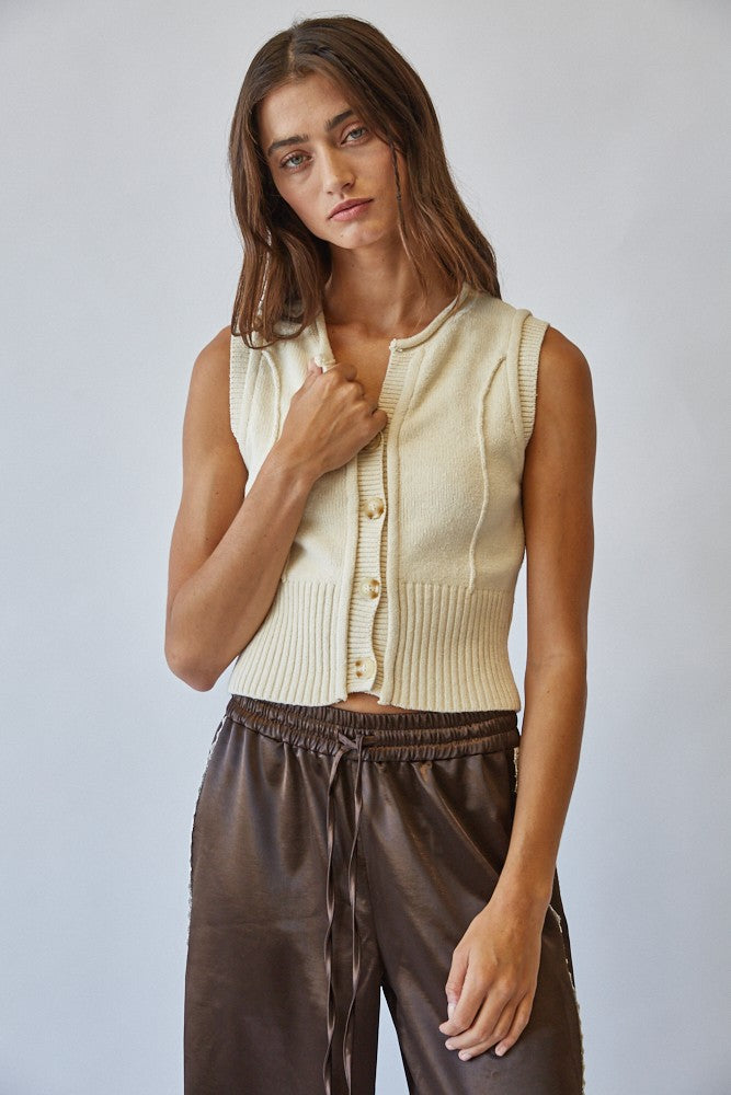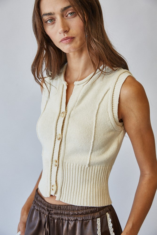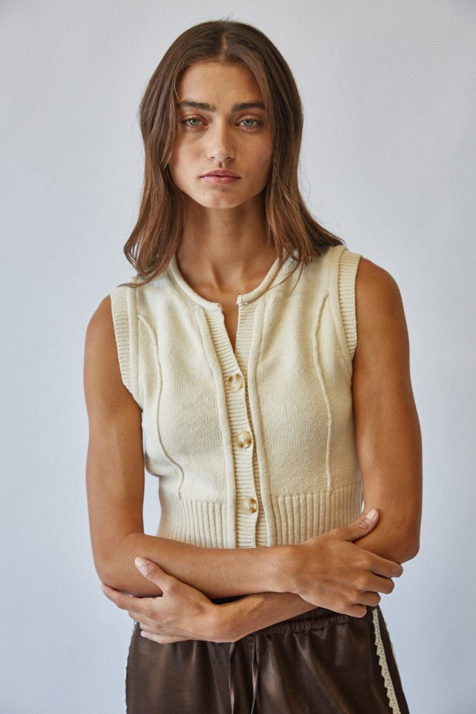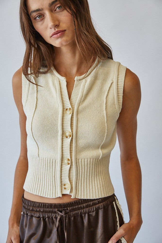 Effortlessly chic, this sleeveless knit vest is a versatile layering piece for every season. Fabric & Fit Crafted from a soft knit blend, it offers a comfortable yet structured feel. The ribbed hem and fitted waistline create a flattering, feminine silhouette, while the sleeveless cut allows for easy layering over tops or under jackets. Key design features Button-down front with classic knit buttons Crew neckline with clean ribbed finish Vertical knit detailing for subtle dimension Wide ribbed hem for a structured fit Cropped length that pairs effortlessly with high-waisted bottoms Recommended Use Perfect for layering in transitional seasons or styling solo with skirts, trousers, or denim. Extra Info COTTON 80% VISCOSE 20%