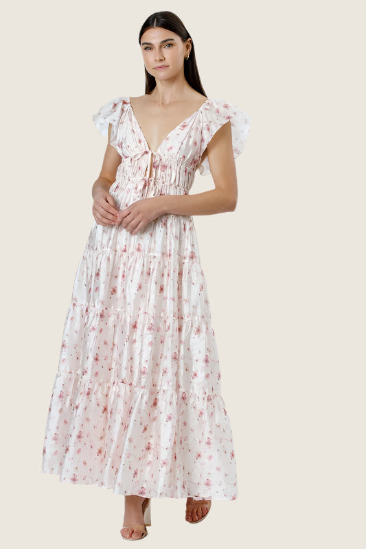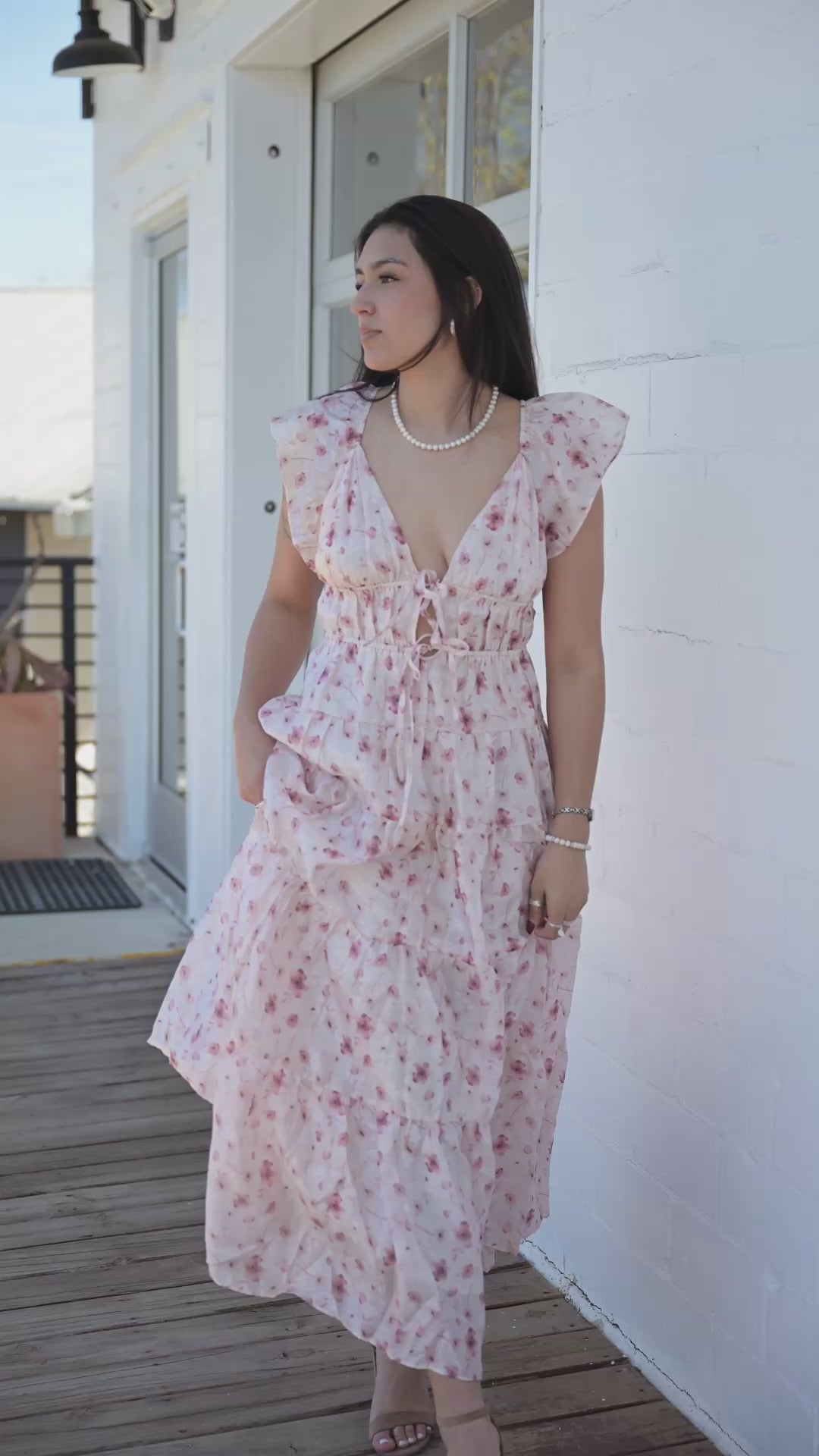 This dress is an ethereal maxi design adorned with a delicate pink floral print, perfect for creating a romantic and whimsical look. The deep V-neckline is complemented by soft flutter sleeves, offering a feminine and airy touch. A charming tie detail at the front enhances the bodice, while the open back adds a graceful and alluring element. The tiered skirt flows beautifully, creating movement and a dreamy silhouette.