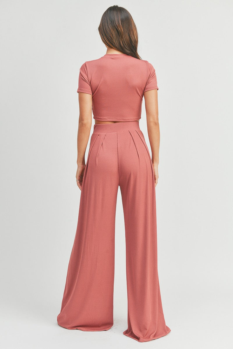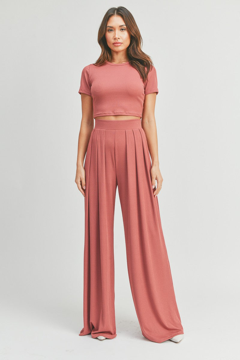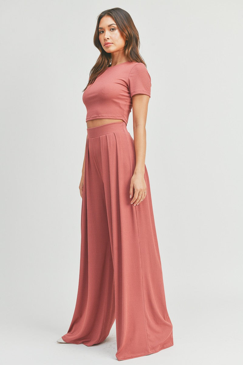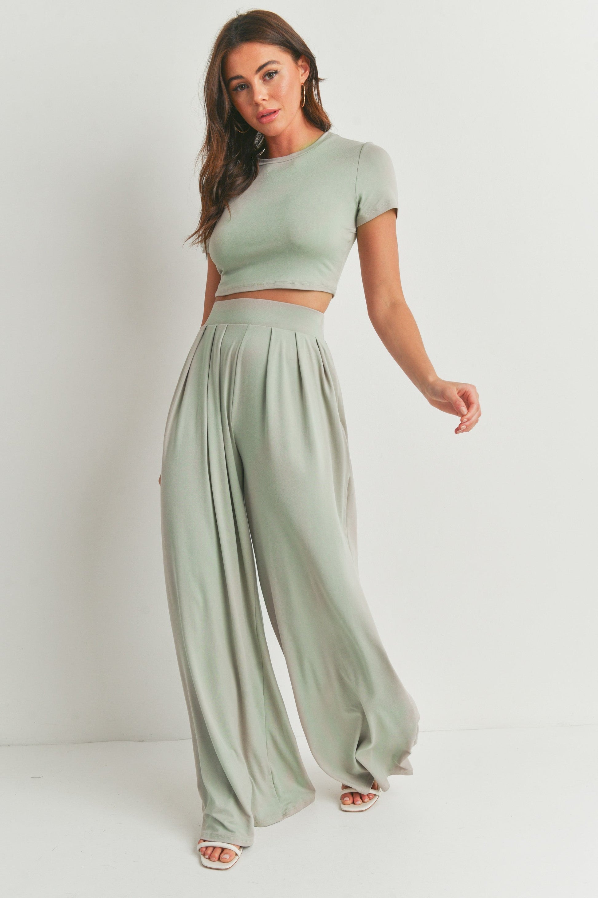 Look and feel your best in the Sage Ribbed Long Pant Set. This fashion-forward matching set features a ribbed texture and sage color making it the perfect choice for trendsetters. Crafted with comfort and stretch in mind, it features wide leg pants and a cropped top for an effortlessly stylish look.