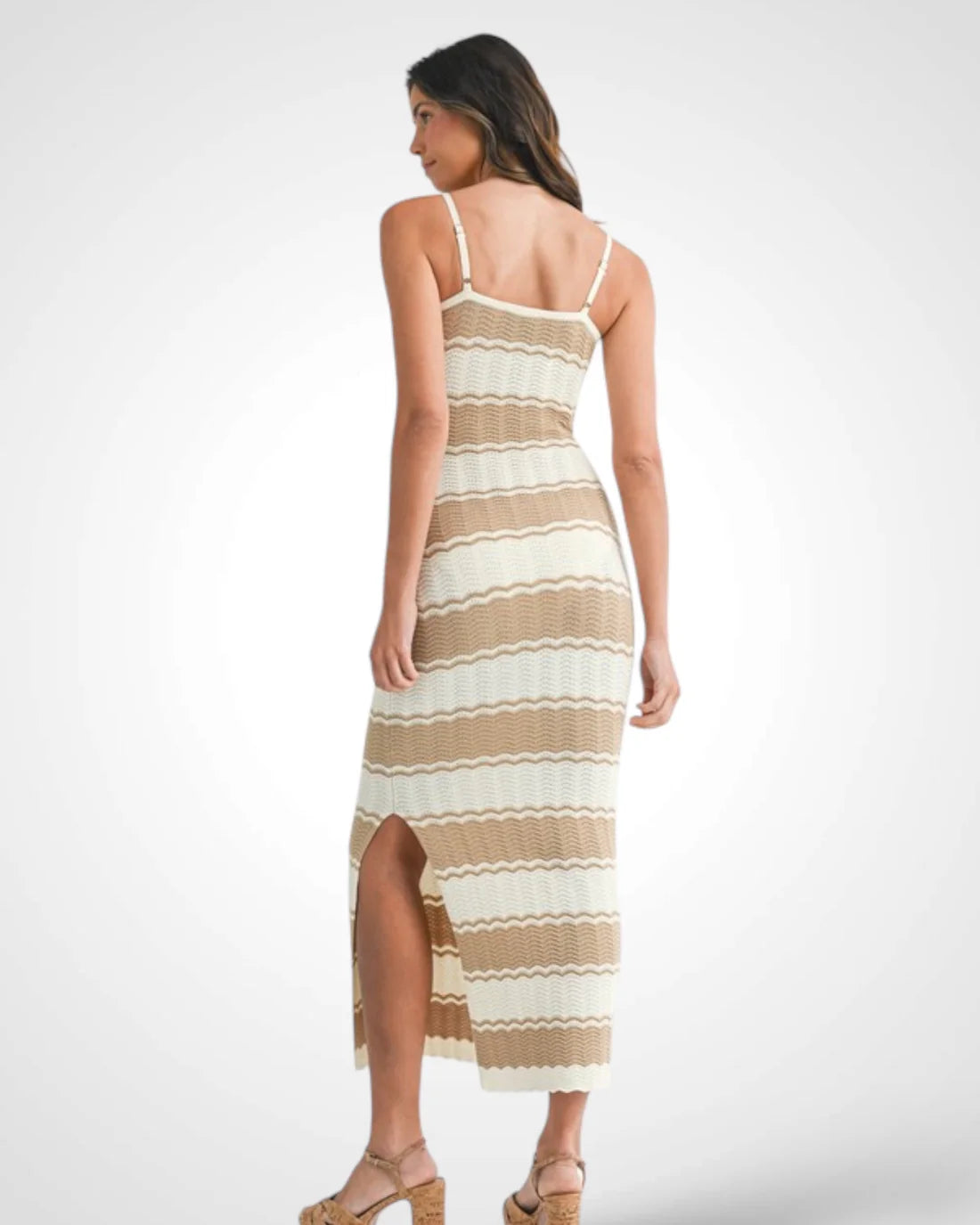 Crafted from striped knit fabric, this bodycon midi dress features adjustable spaghetti straps for a precise fit. The front cut-out is detailed with wooden beads, combining texture and visual interest. A side slit enhances mobility while maintaining the dress’s streamlined silhouette, making it a versatile piece for both casual and refined settings.