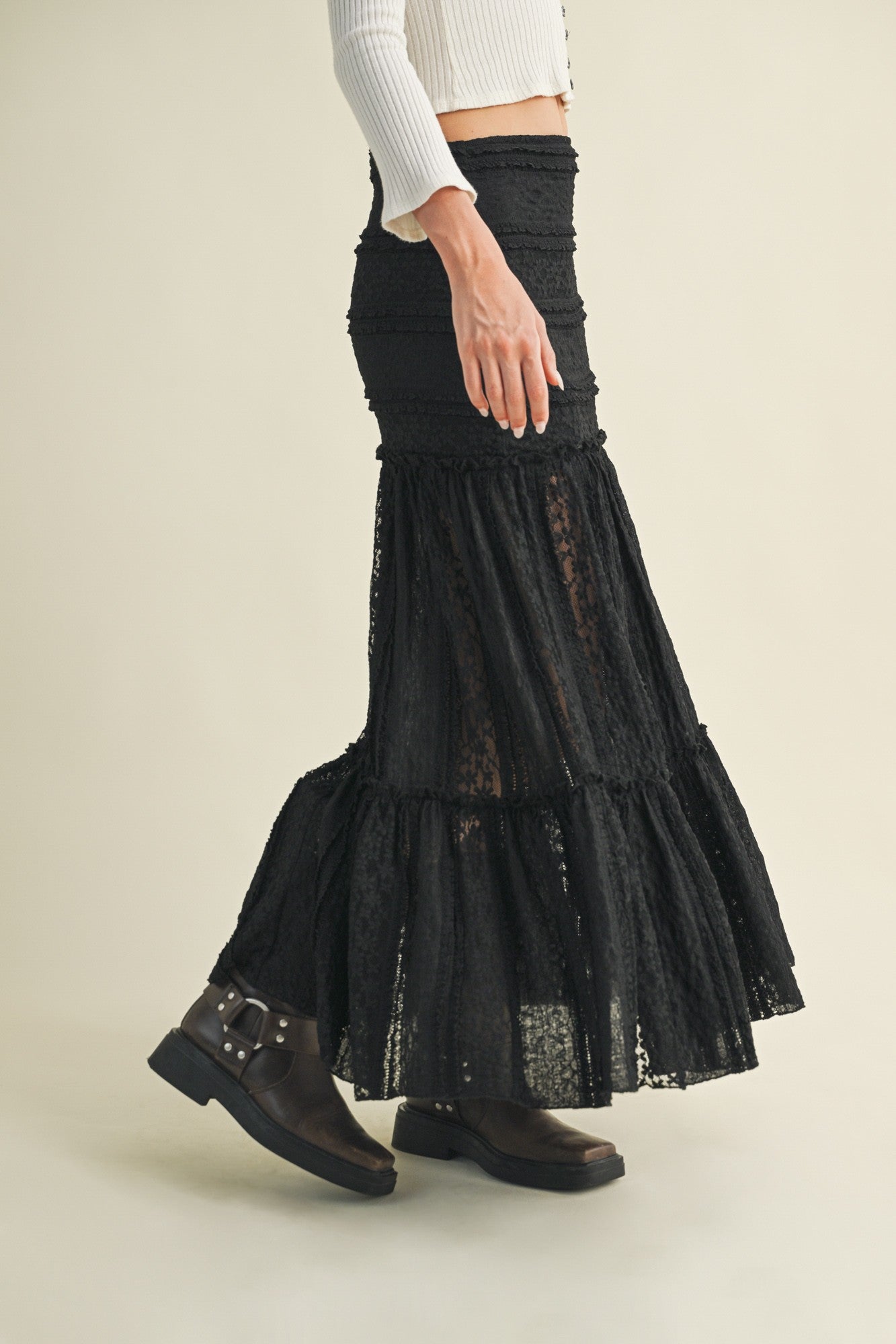 Step into the spotlight with this playful black lace tiered skirt! Its sheer layers add a whimsical touch perfect for festival vibes or layering up stylishly during fall. Whether paired with boots or sandals, this skirt brings fun and flirty flair to any outfit.